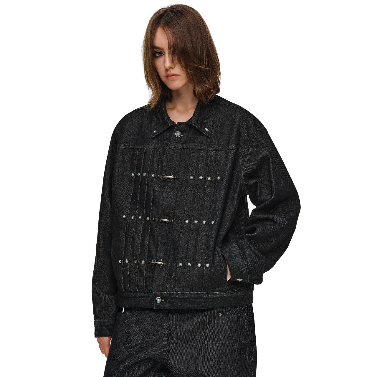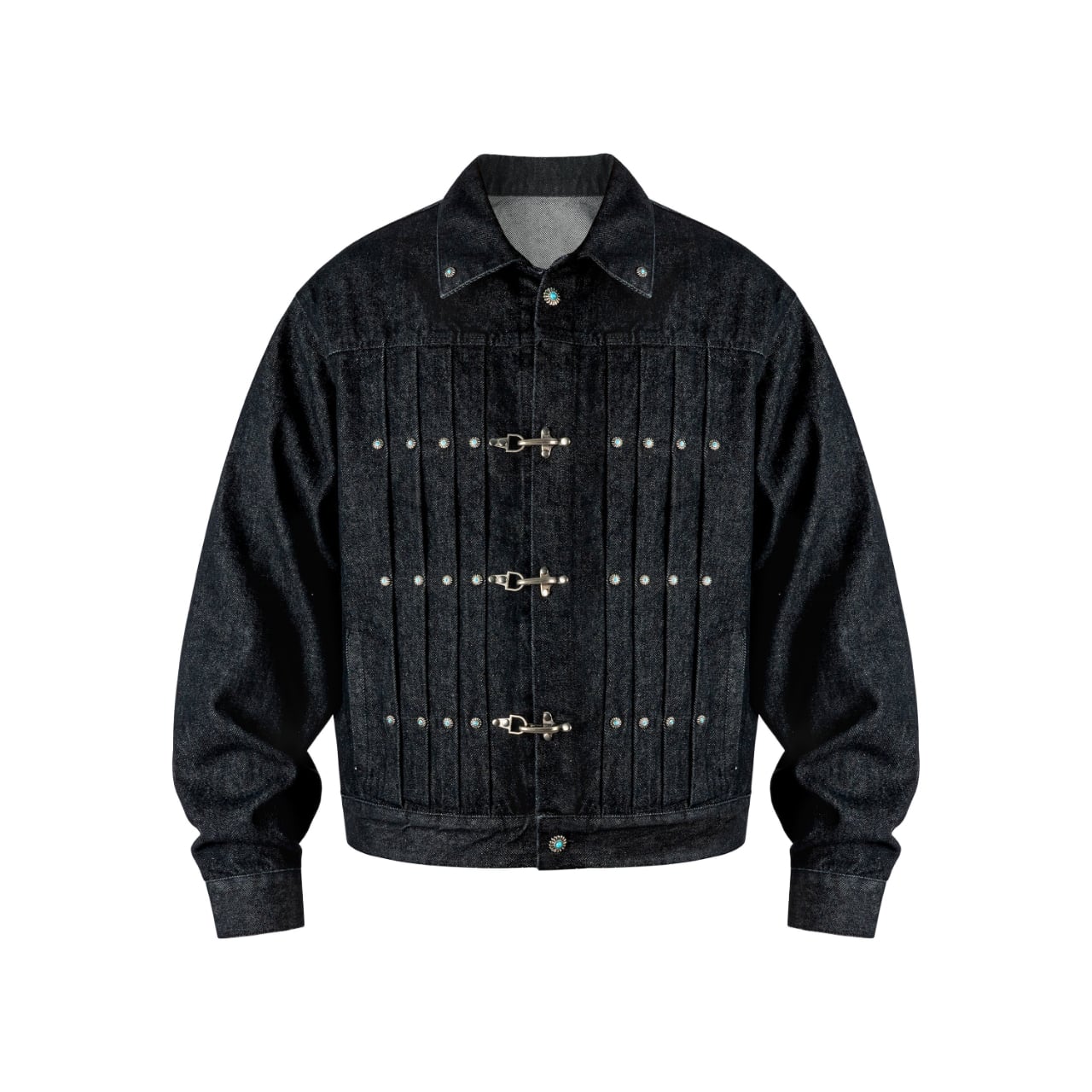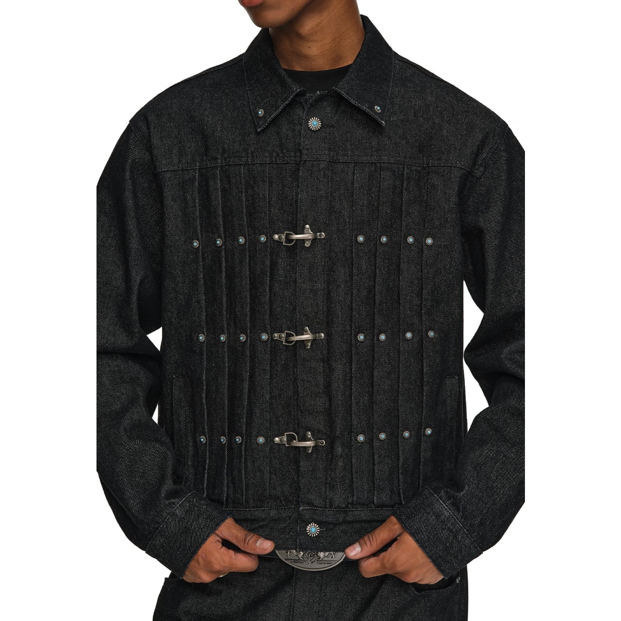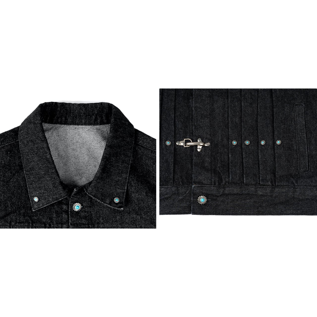 ヴィンテージ加工を施したデニム生地に、ターコイズカラーのスタッズとメタルフックが特徴的なワークジャケット。