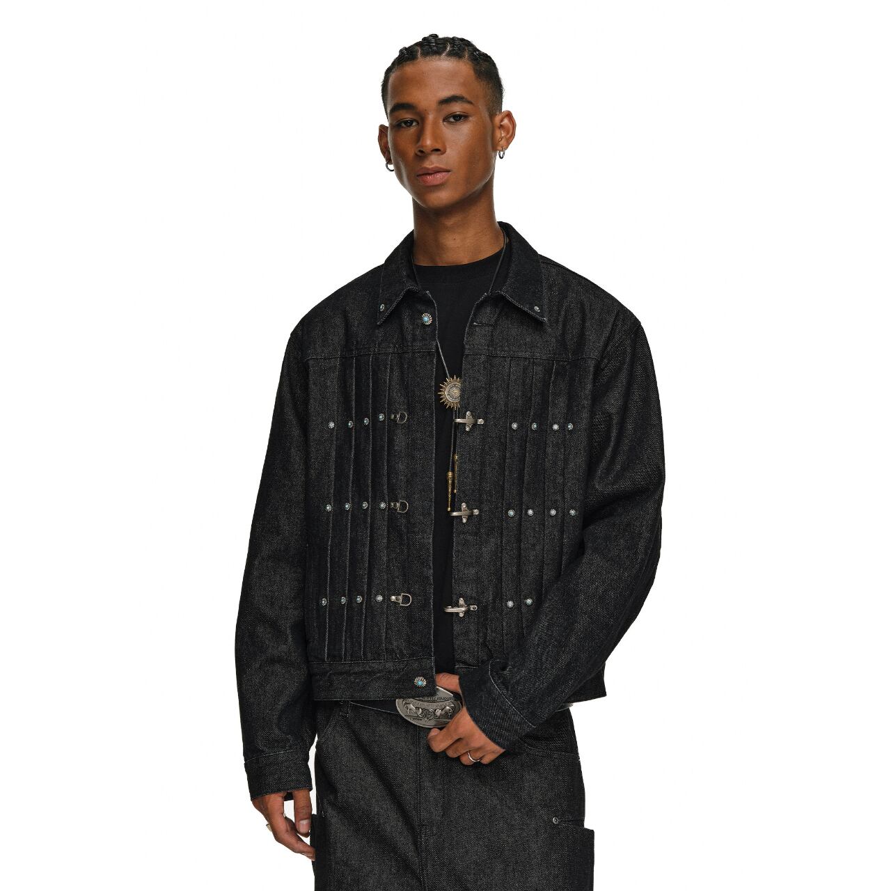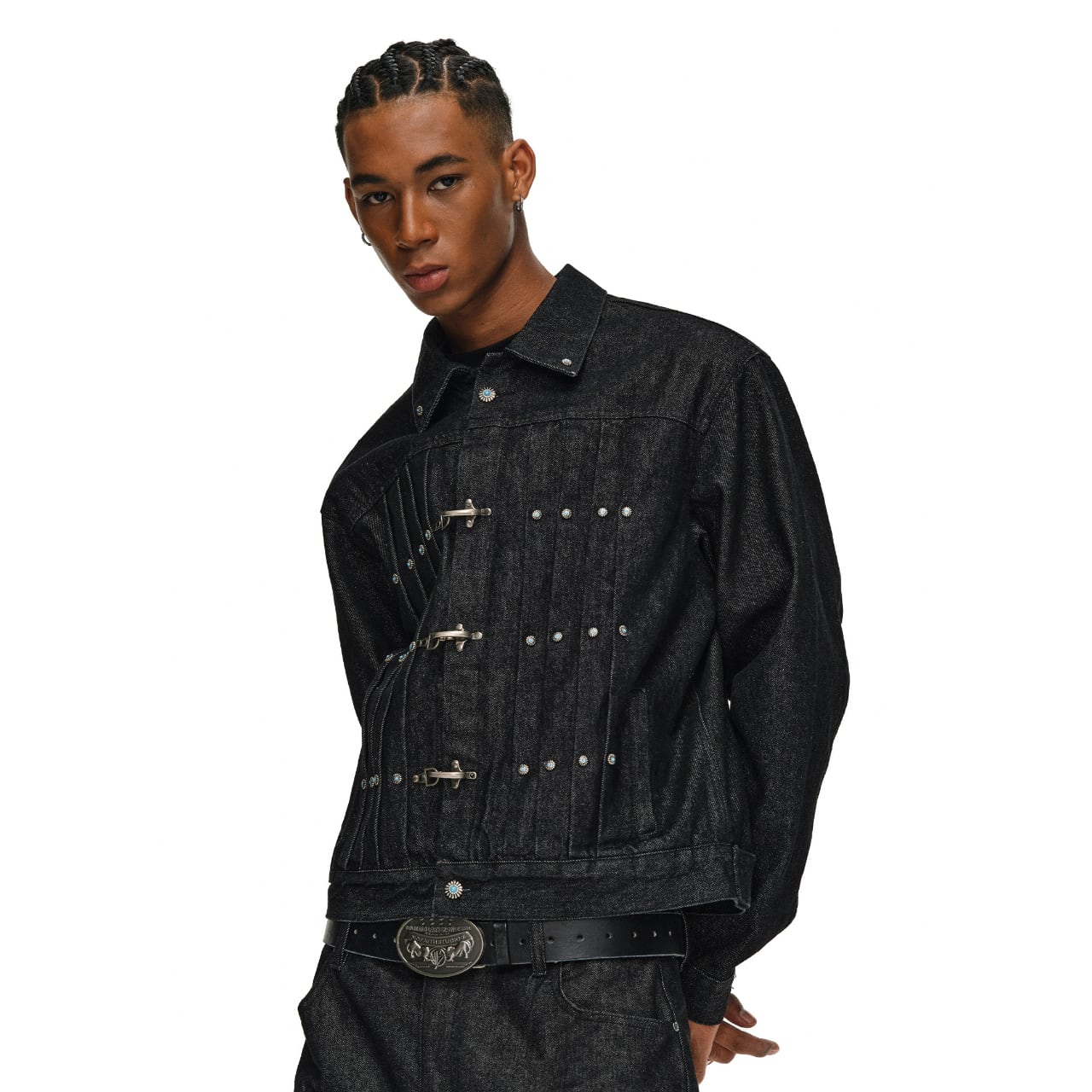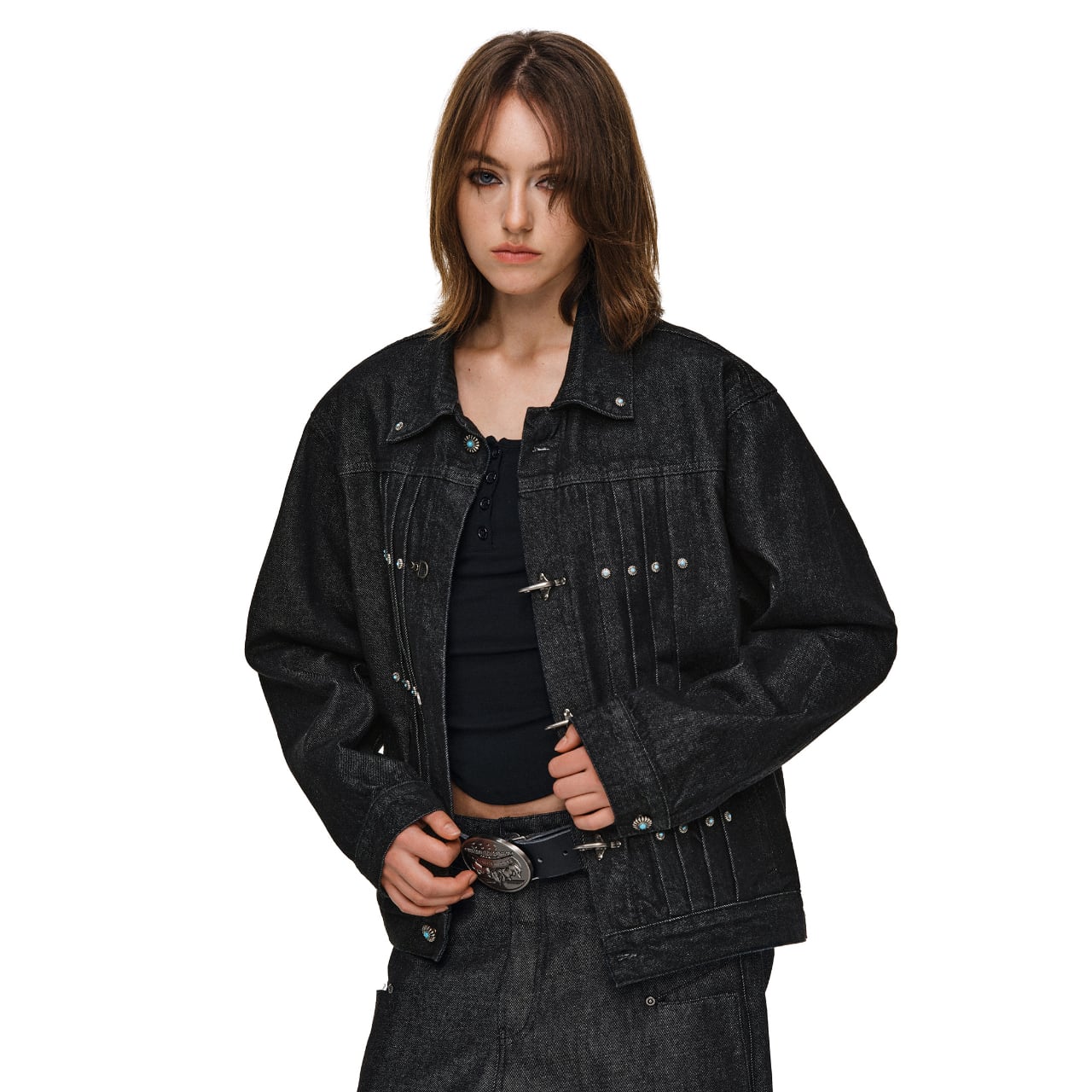 ヴィンテージ加工を施したデニム生地に、ターコイズカラーのスタッズとメタルフックが特徴的なワークジャケット。