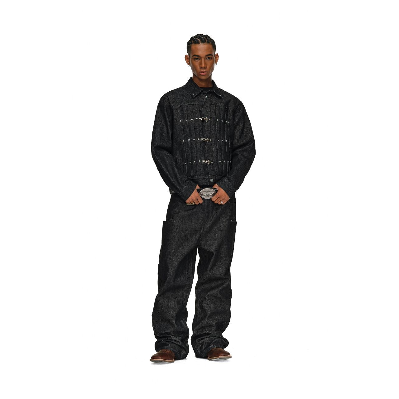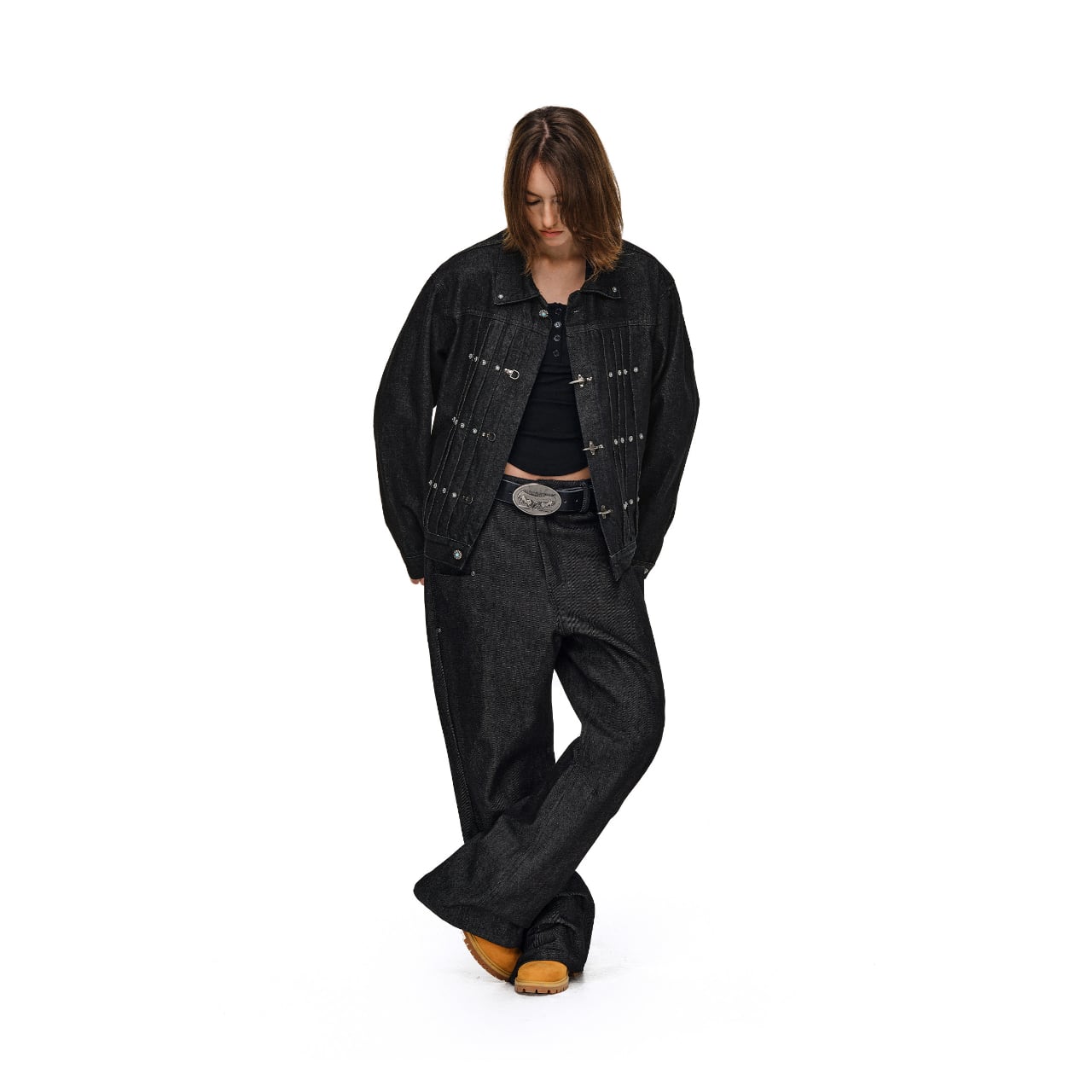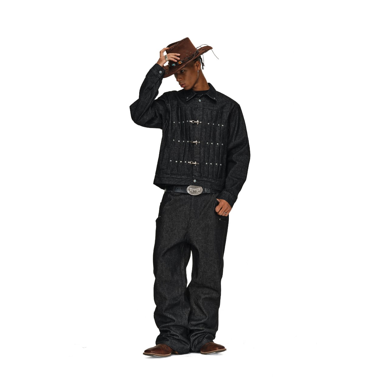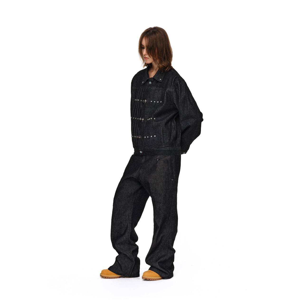 ヴィンテージ加工を施したデニム生地に、ターコイズカラーのスタッズとメタルフックが特徴的なワークジャケット。