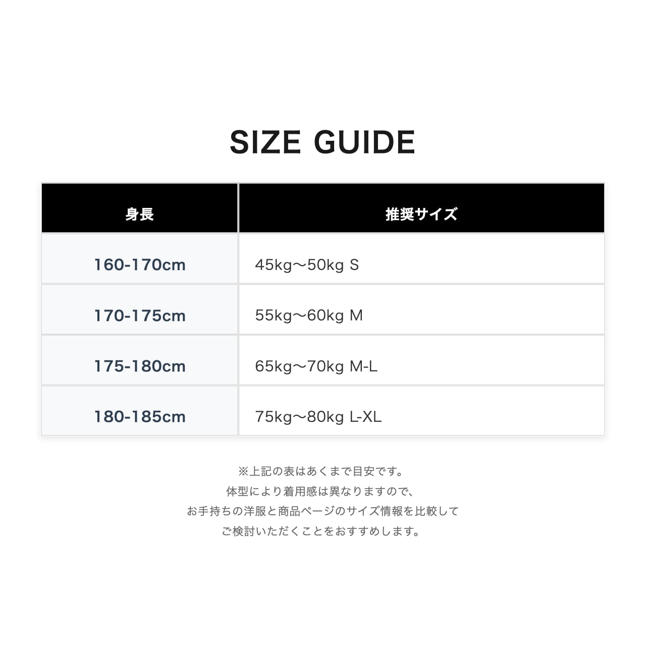 体型により着用感は異なりますので、お手持ちの洋服と商品ページのサイズ情報を比較してご検討いただくことをおすすめします。