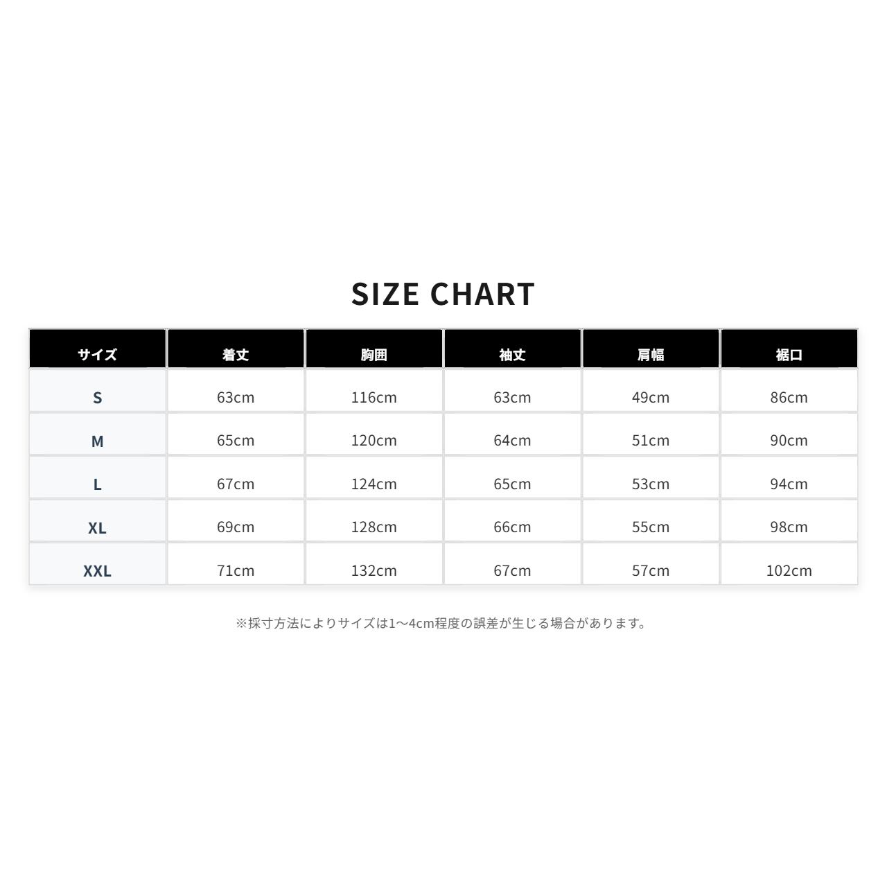 【S】 着丈63cm/胸囲116cm/袖丈63cm/肩幅49cm/裾口86cm