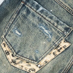 膝部分やバックポケットにはレオパード柄のパッチが施され、ストリートスタイルに個性をプラス。