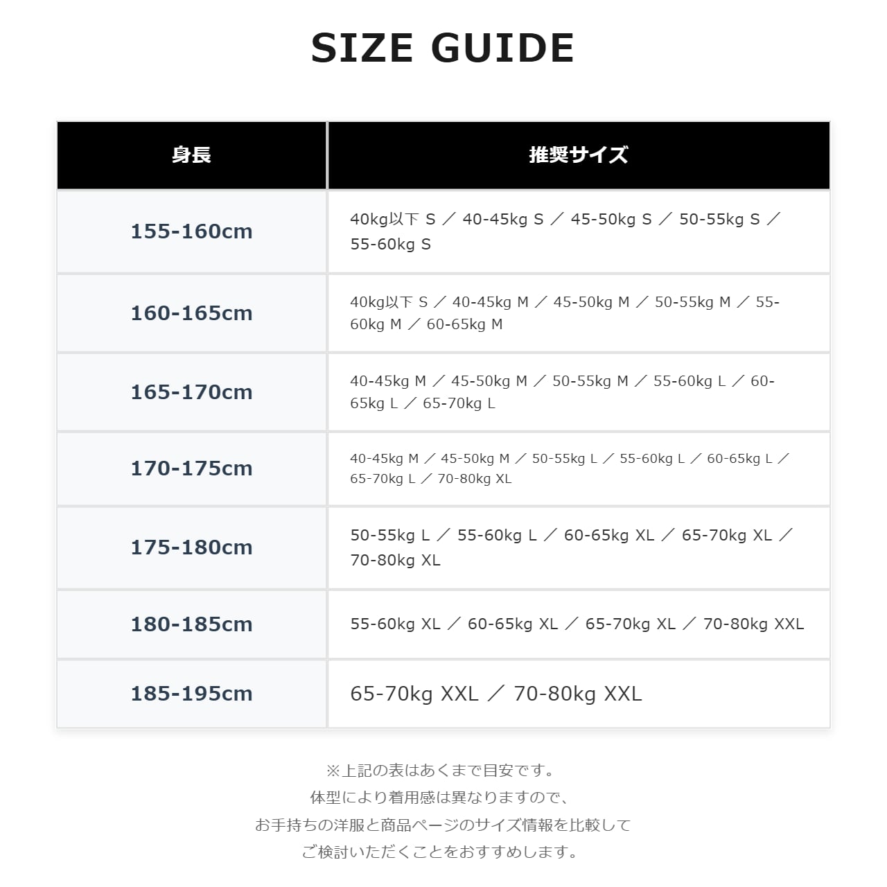 [165-170cm] 40-45kg M / 45-50kg M / 50-55kg M / 55-60kg L / 60-65kg L / 65-70kg L