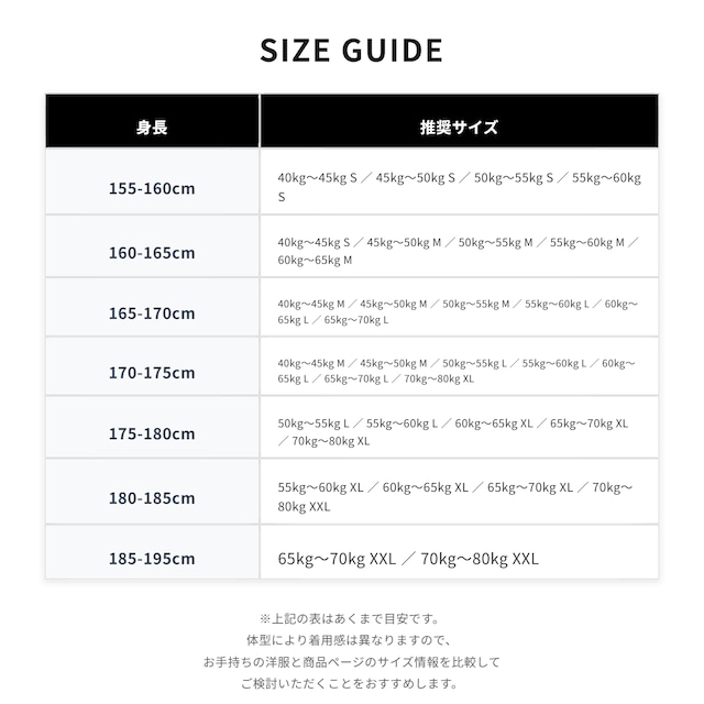 [180-185cm] 55kg~60kg XL / 60kg~65kg XL / 65kg~70kg XL / 70kg~80kg XXL