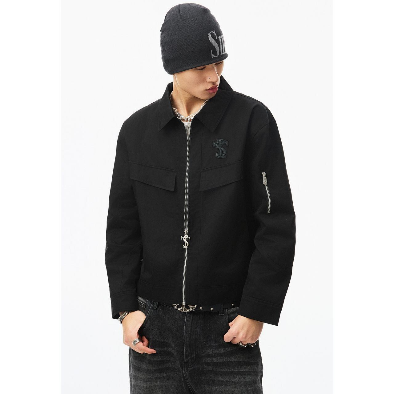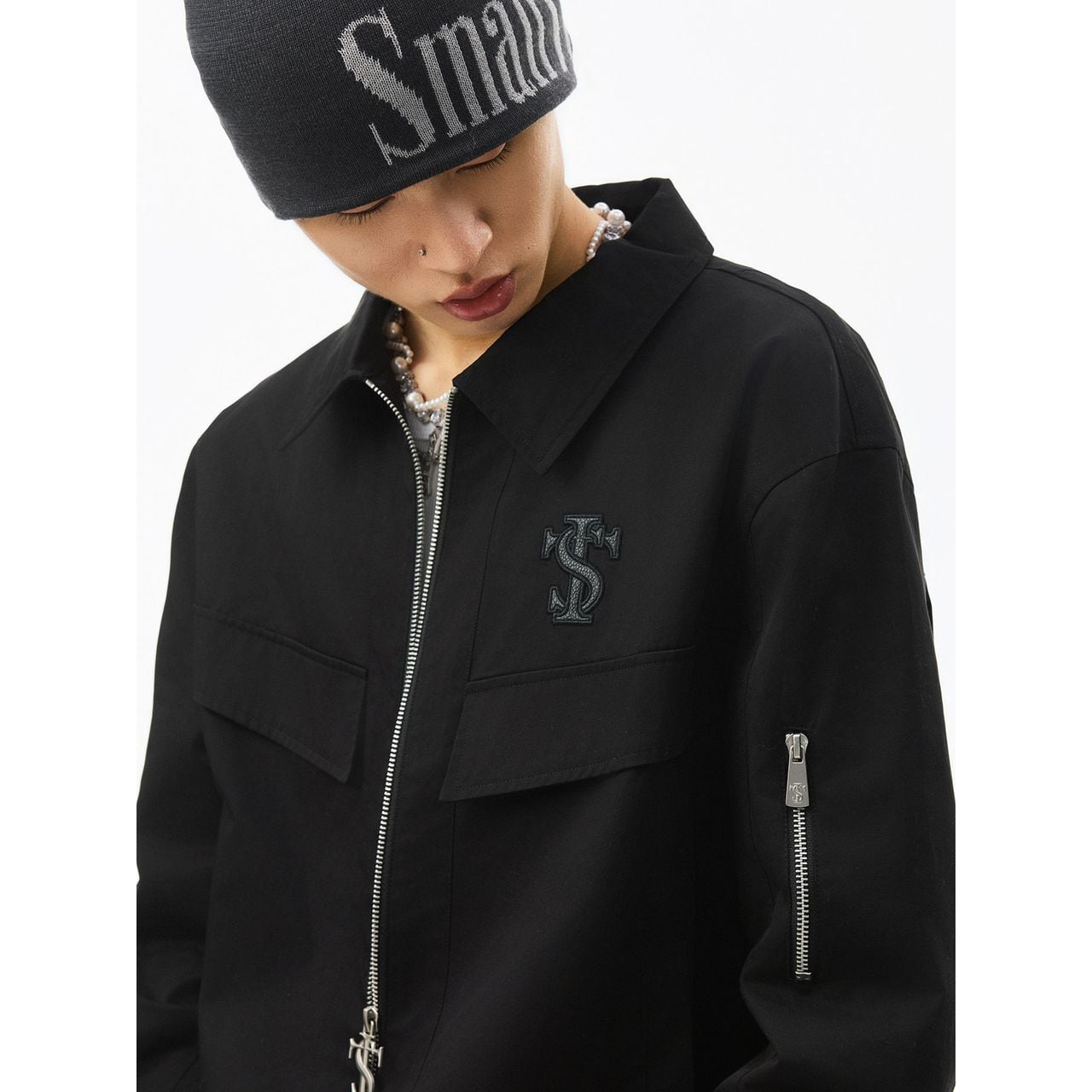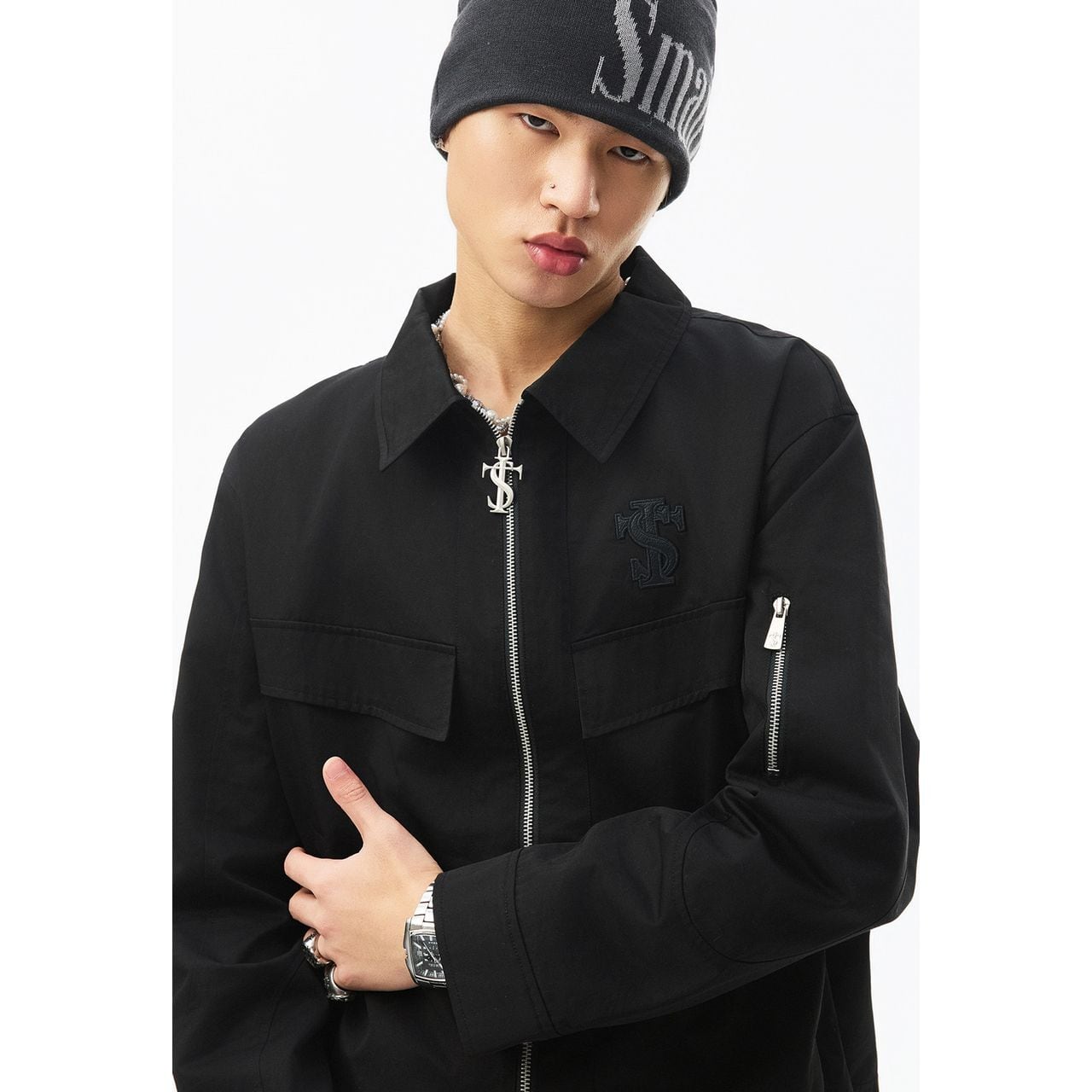 袖にはジップポケットを配置し、ストリート感を強調したデザイン。