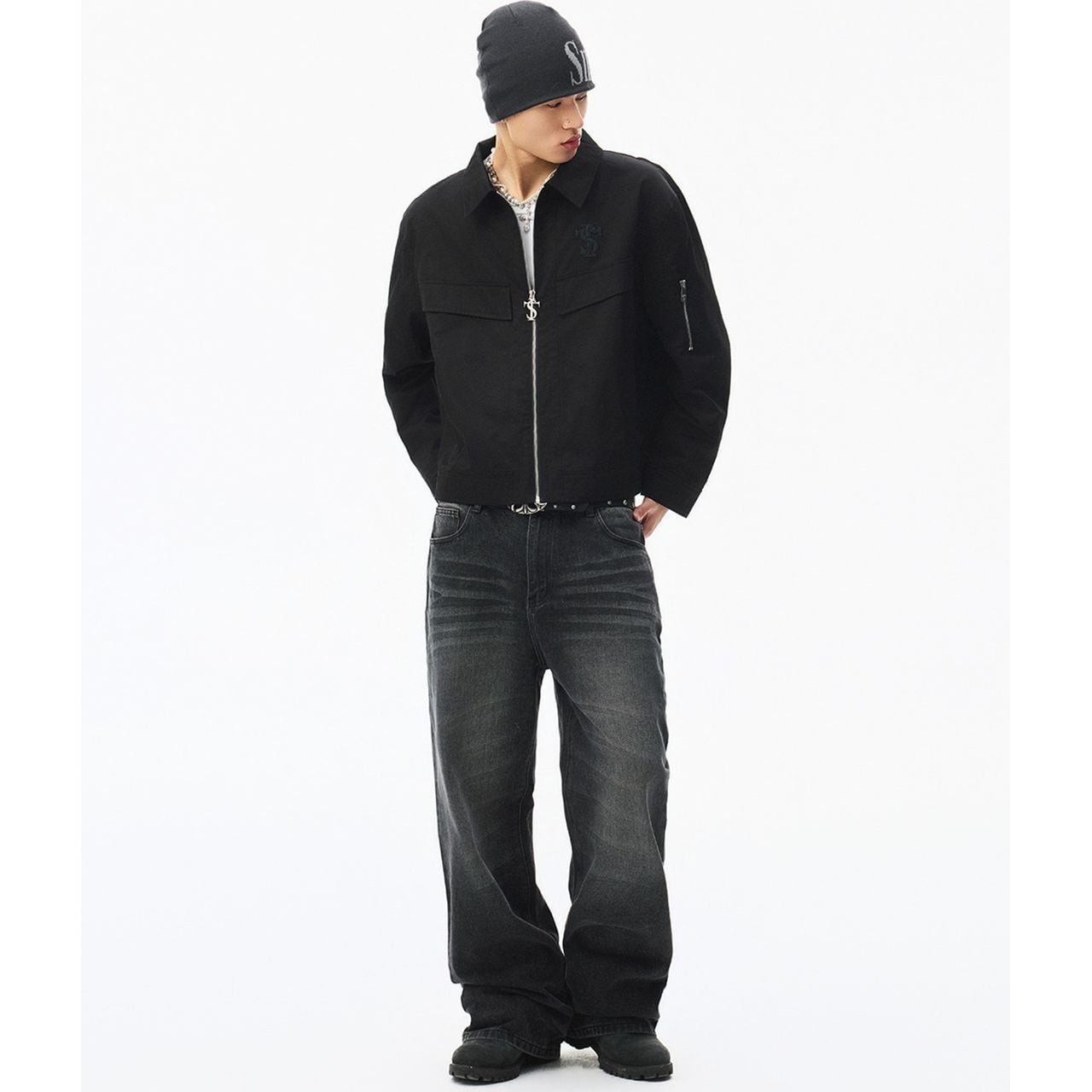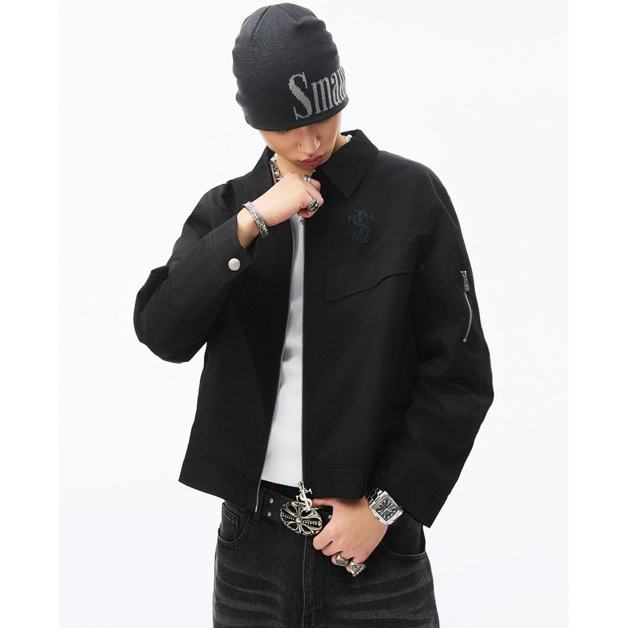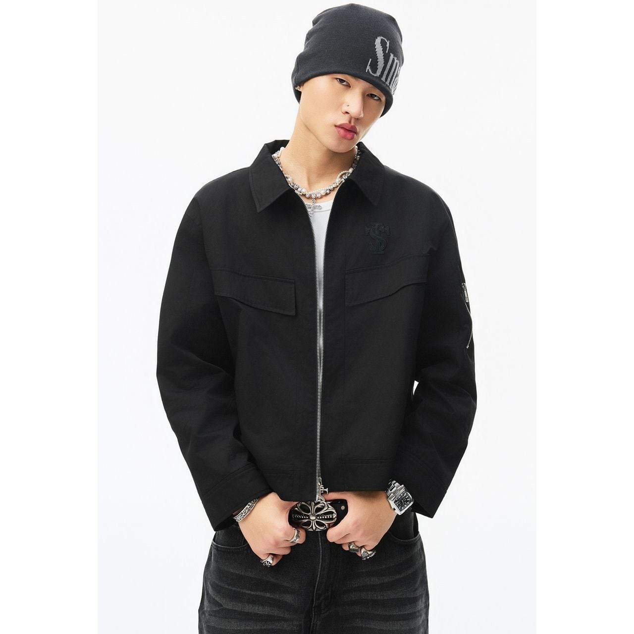 袖にはジップポケットを配置し、ストリート感を強調したデザイン。