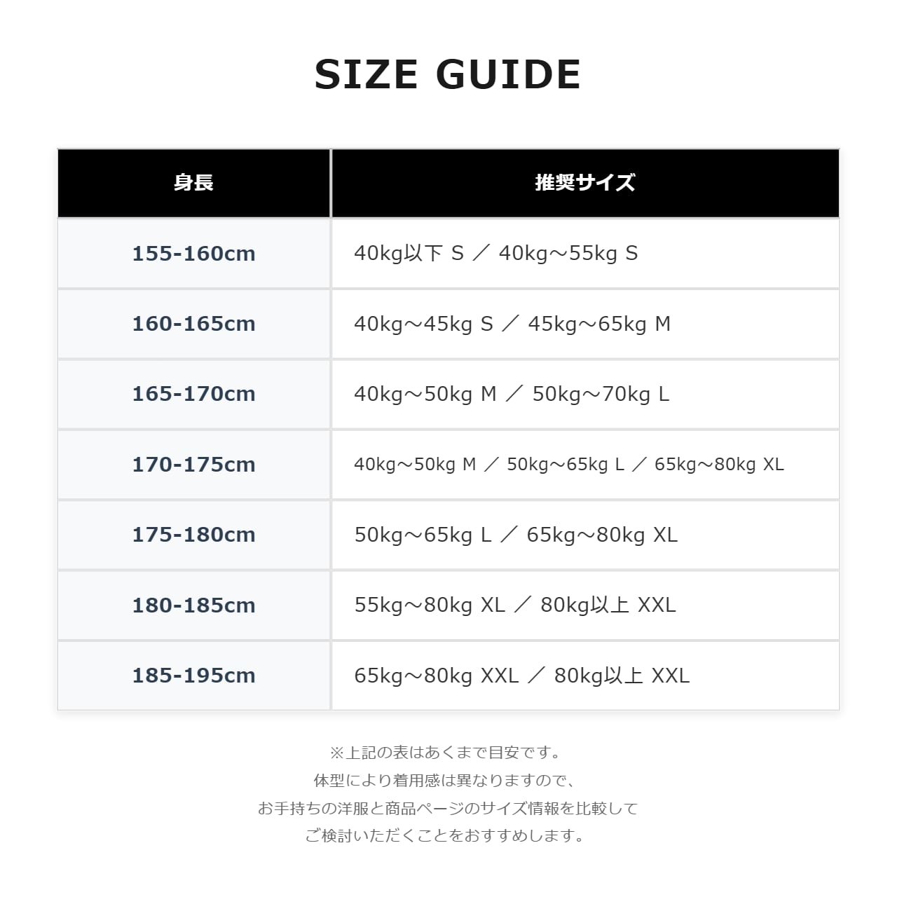 ■ 身長別 サイズ推奨リスト