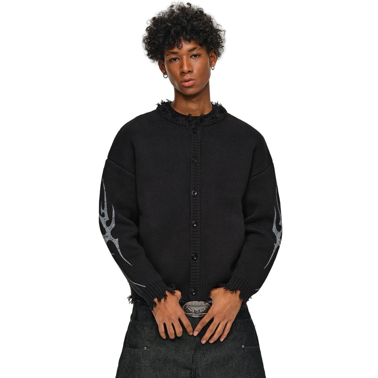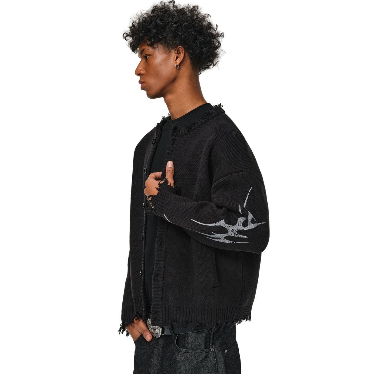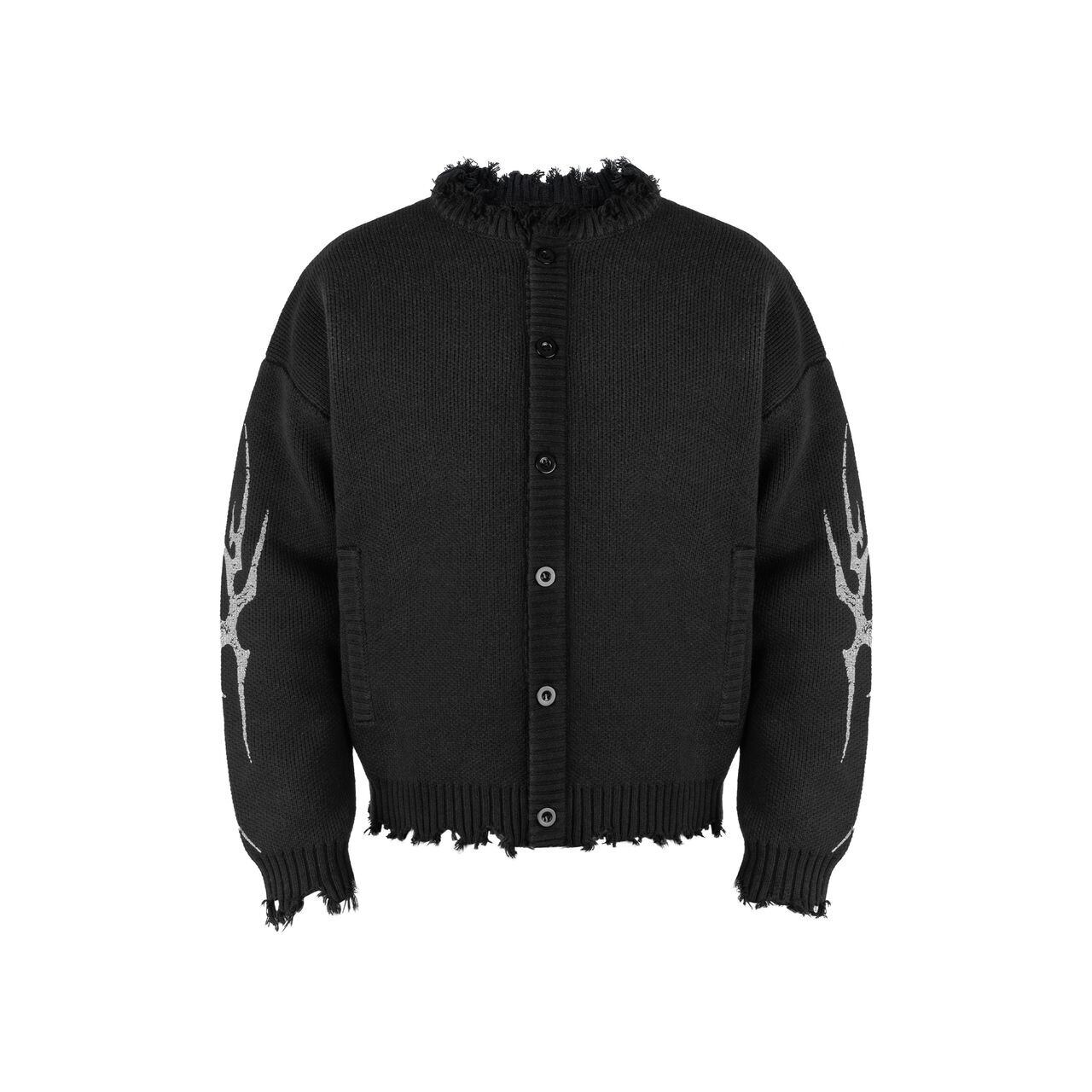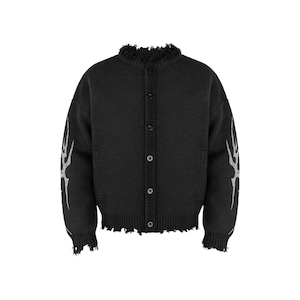 袖にあしらわれたトライバル柄のグラフィックが、ストリートスタイルにエッジを効かせるカーディガン。
