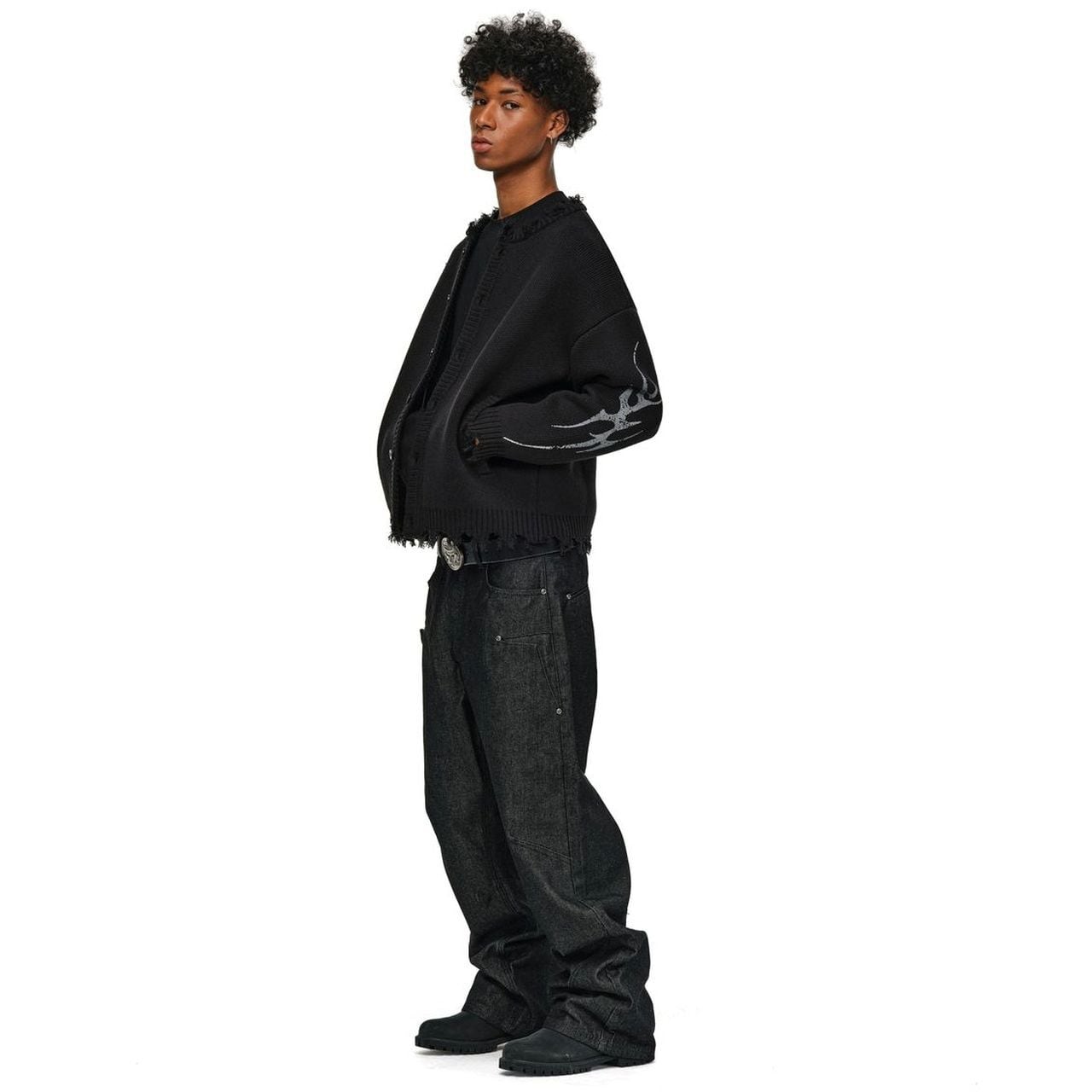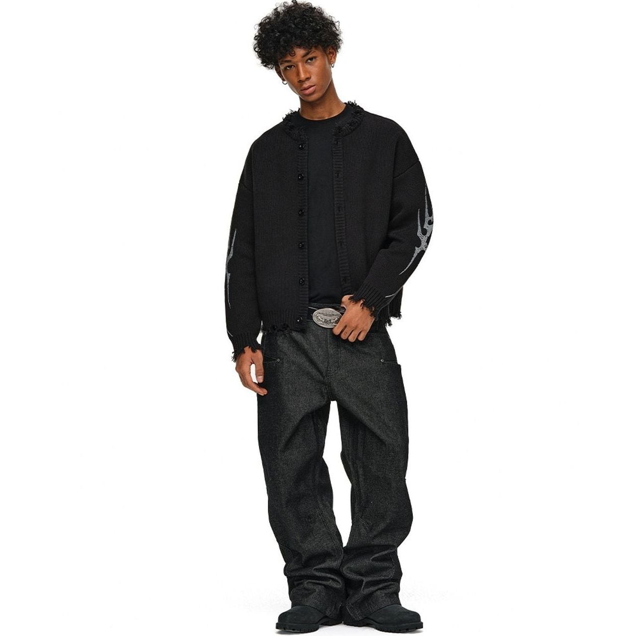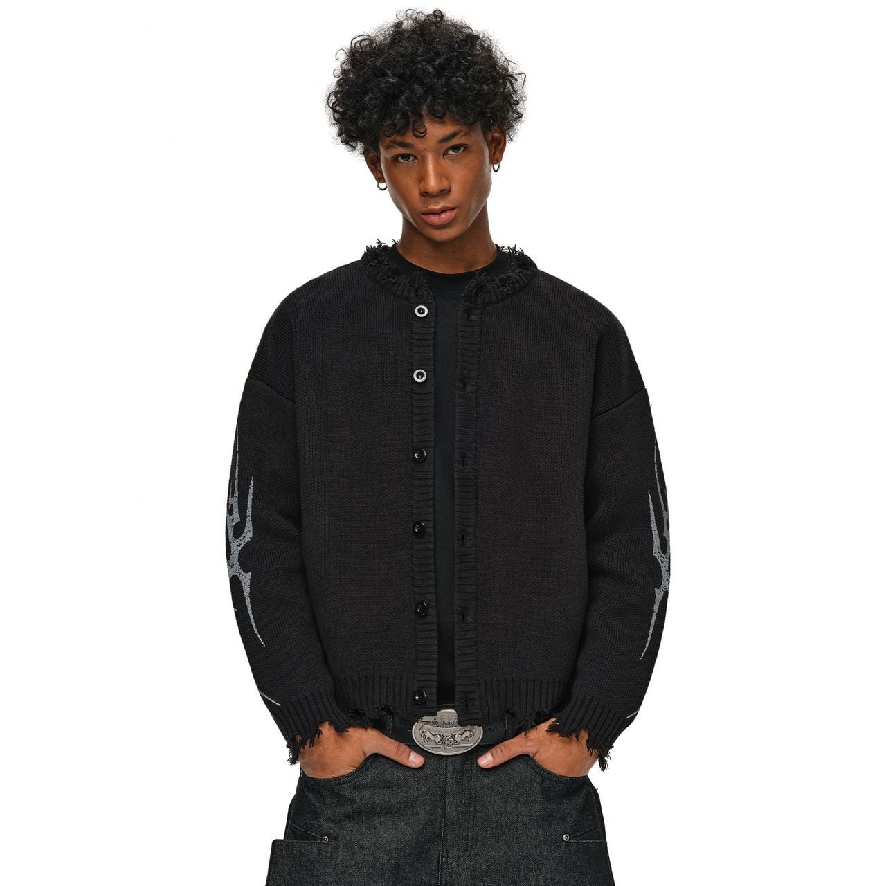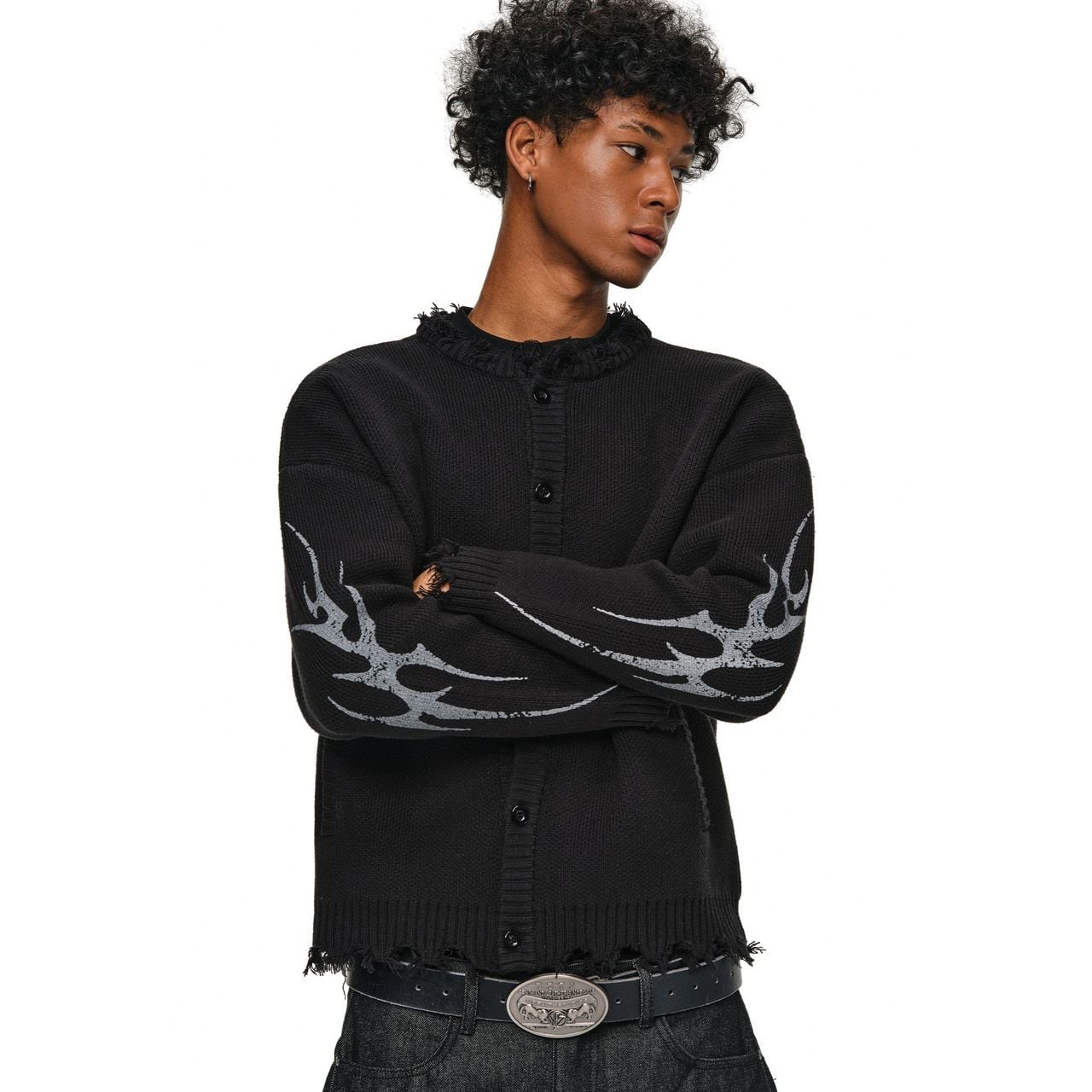 袖にあしらわれたトライバル柄のグラフィックが、ストリートスタイルにエッジを効かせるカーディガン。