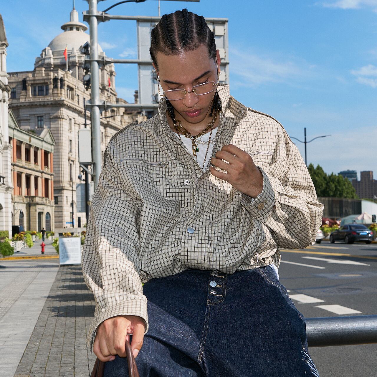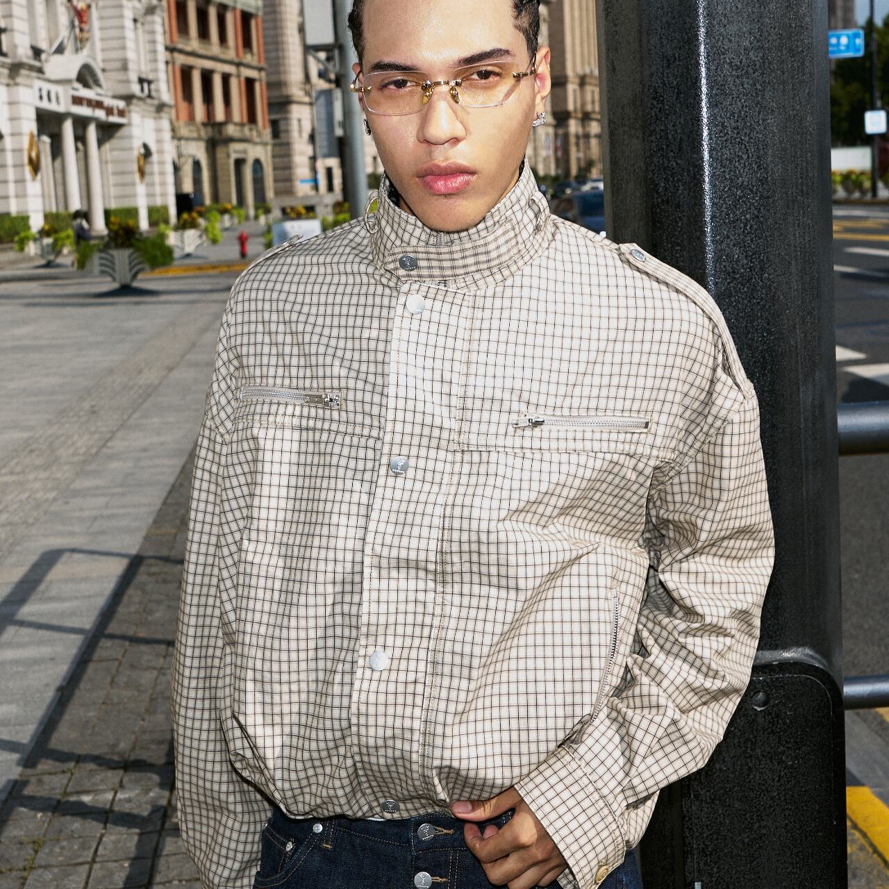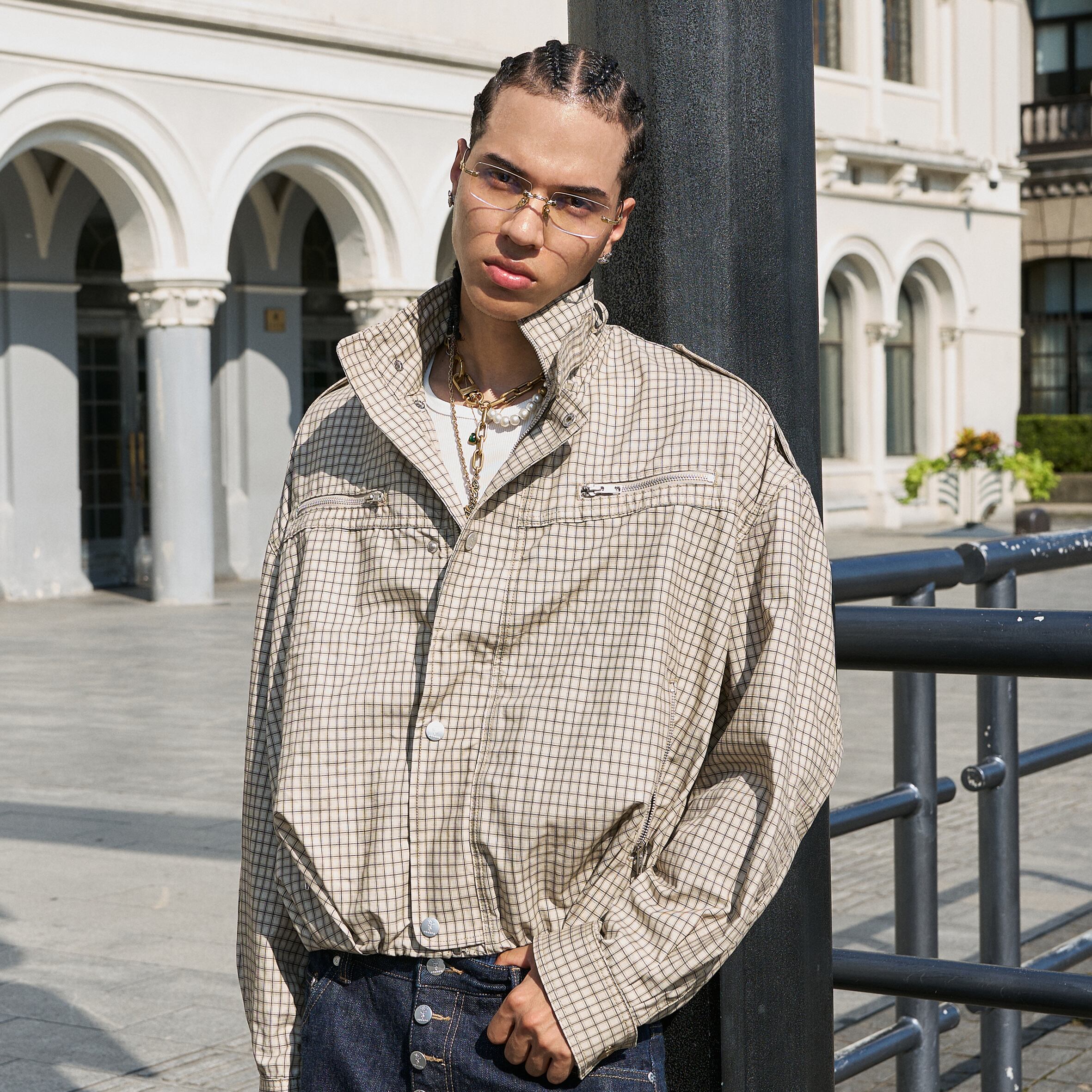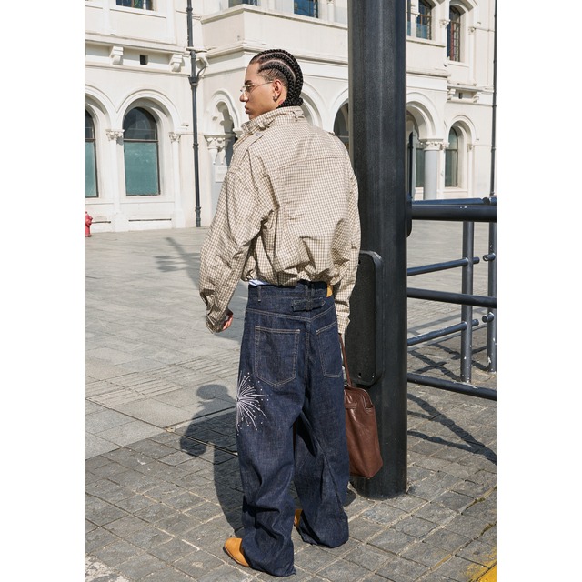 ゆったりとしたボックスシルエットで、ストリートスタイルにGeek Chicな要素をプラス。