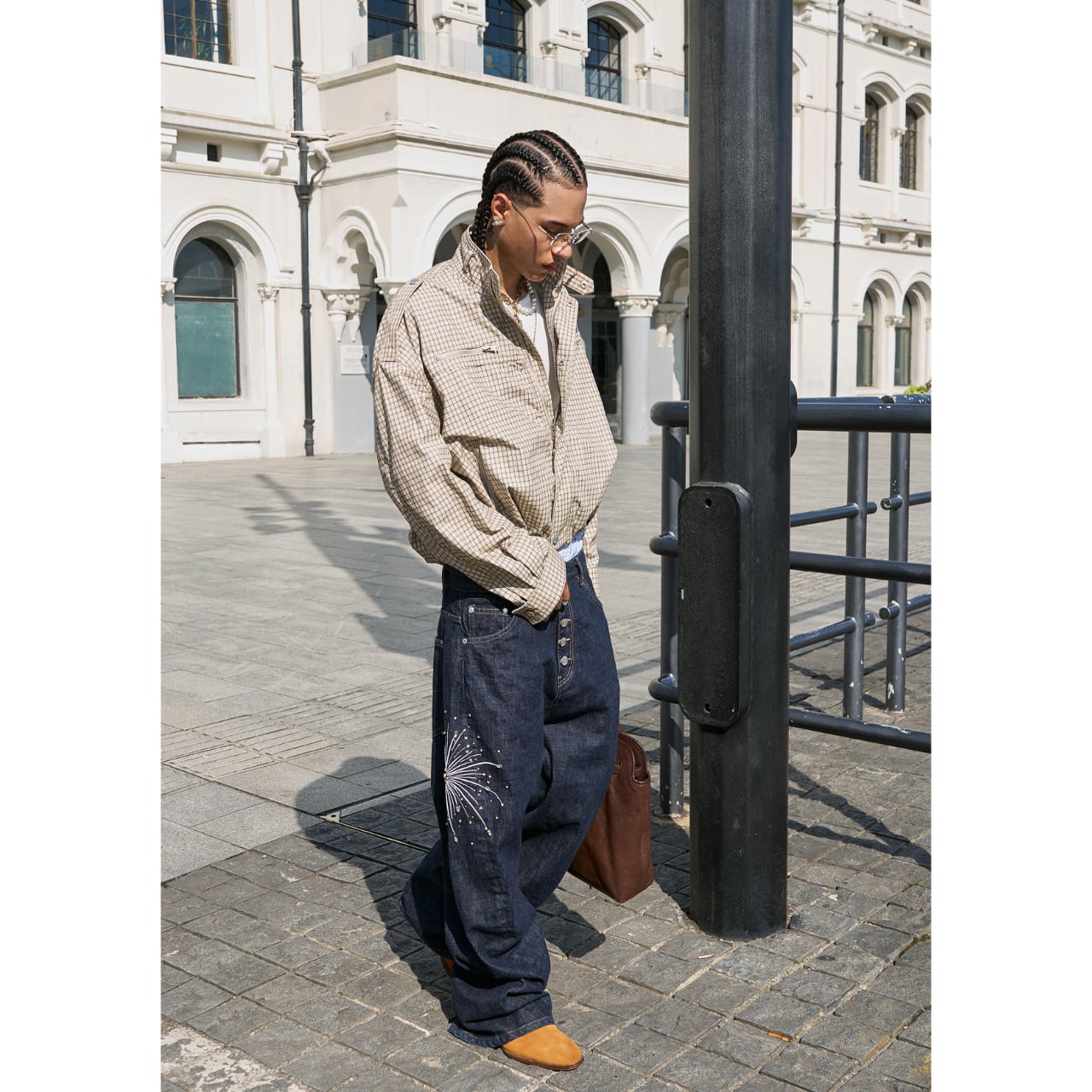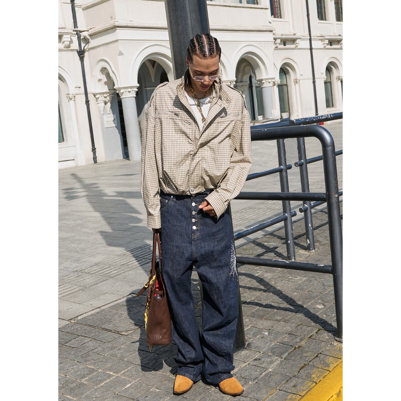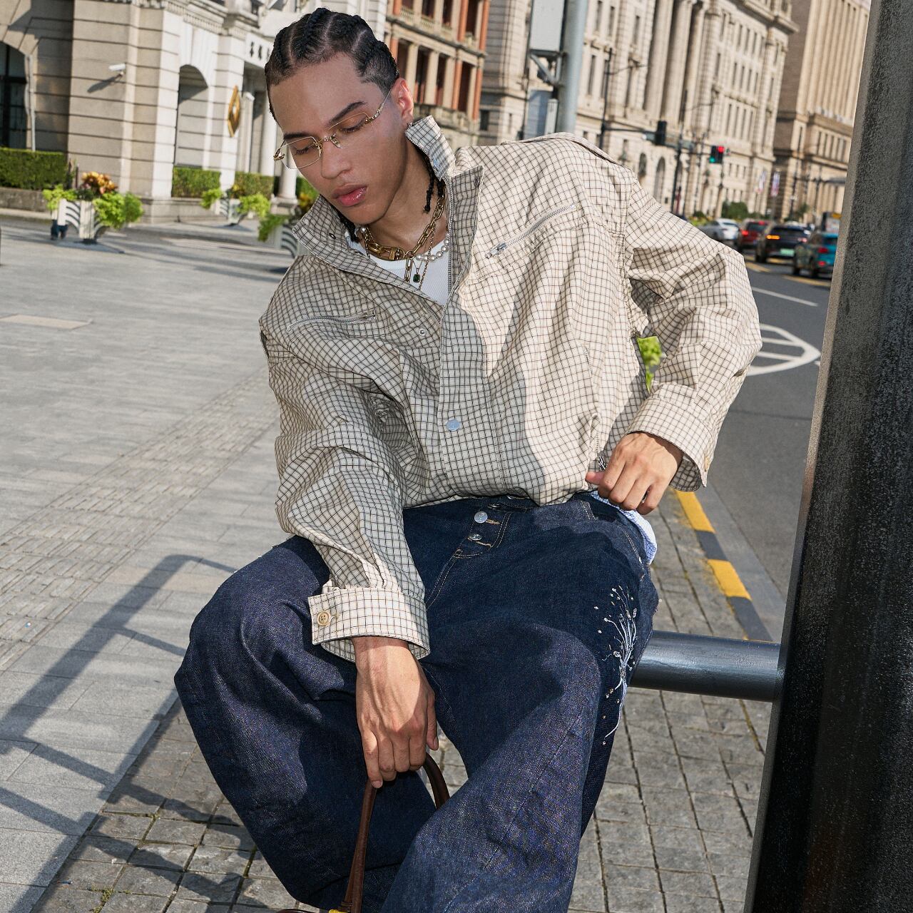 ゆったりとしたボックスシルエットで、ストリートスタイルにGeek Chicな要素をプラス。