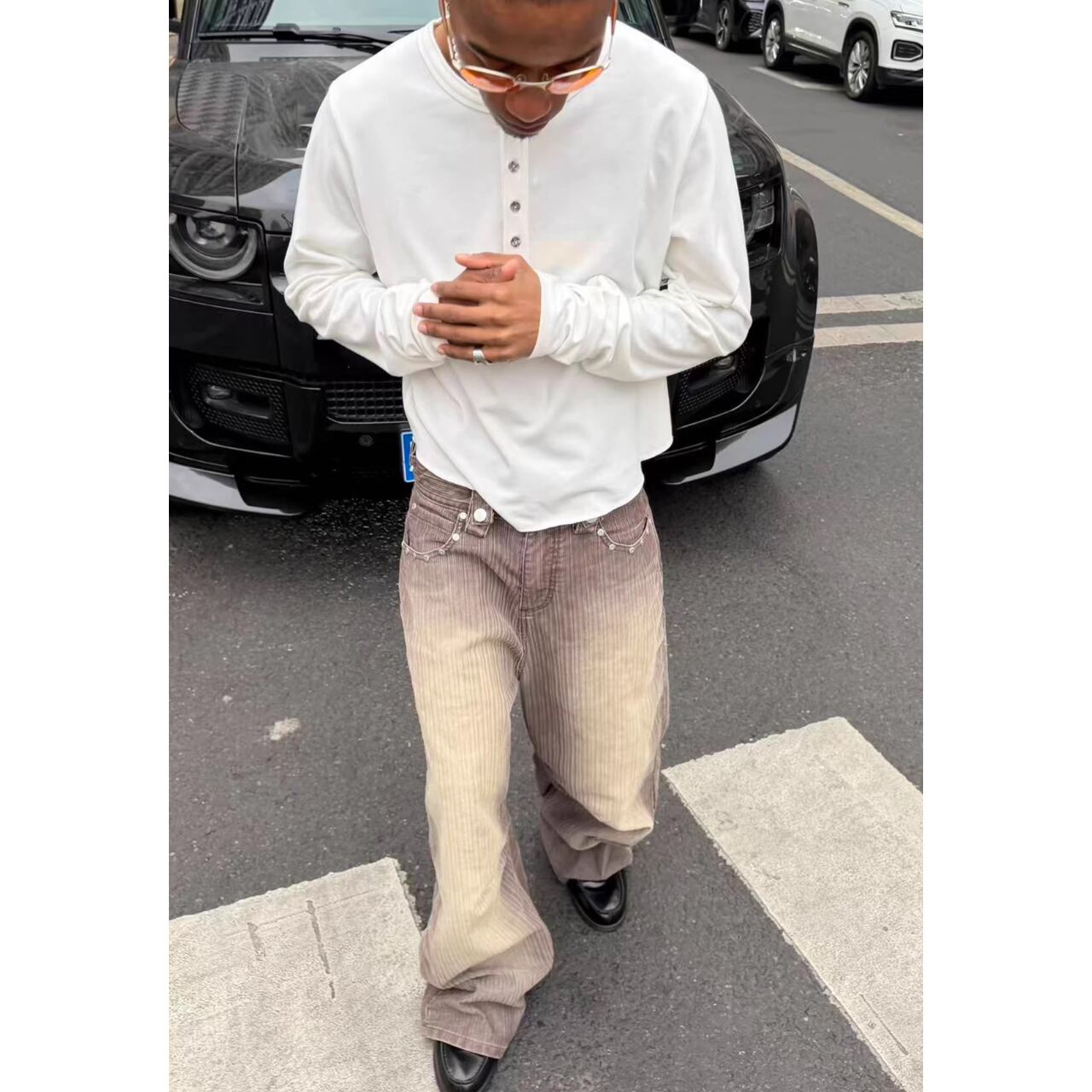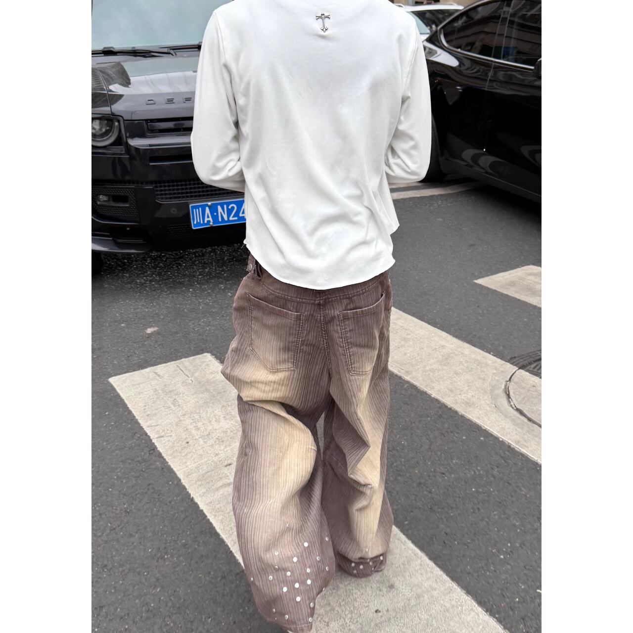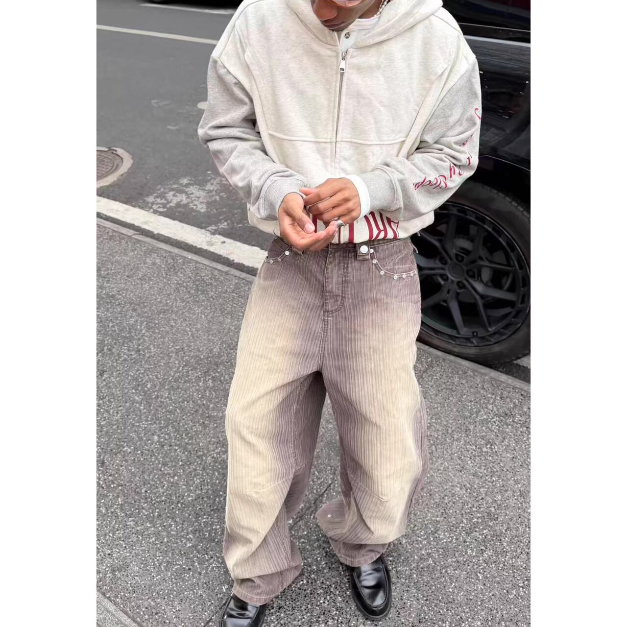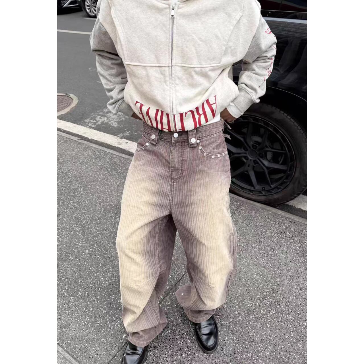 ルーズなシルエットと裾のスタッズが、ストリートスタイルに存在感をプラスします。