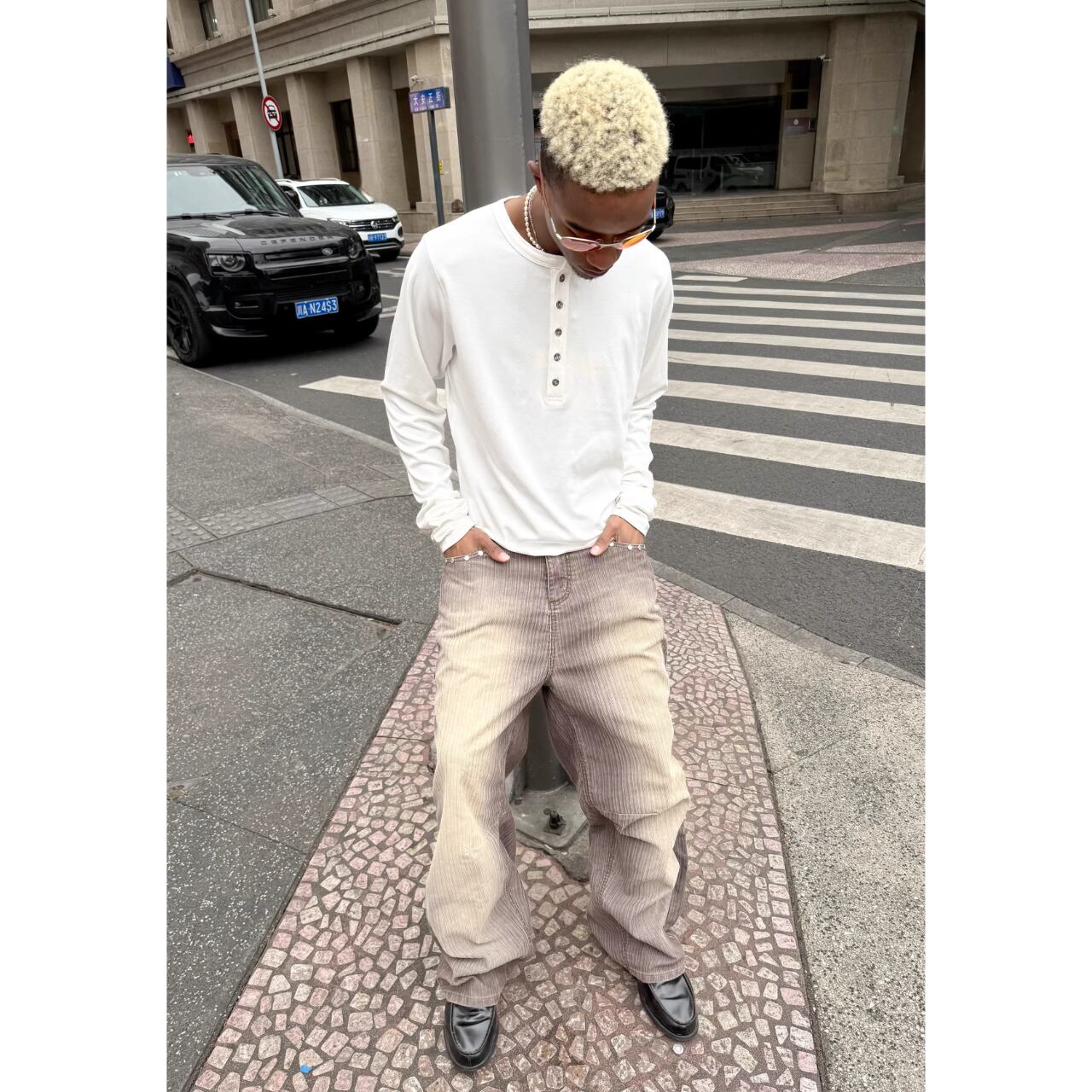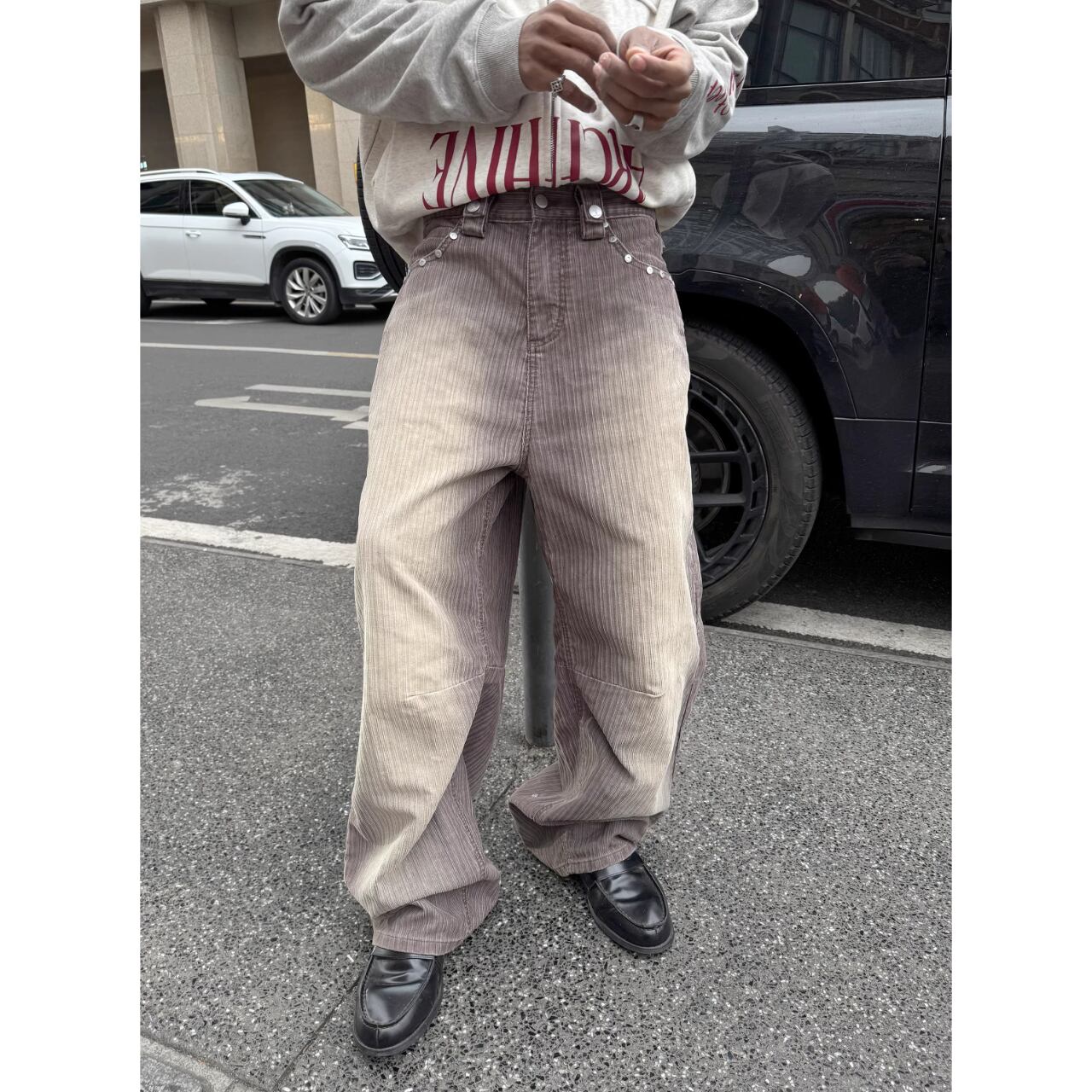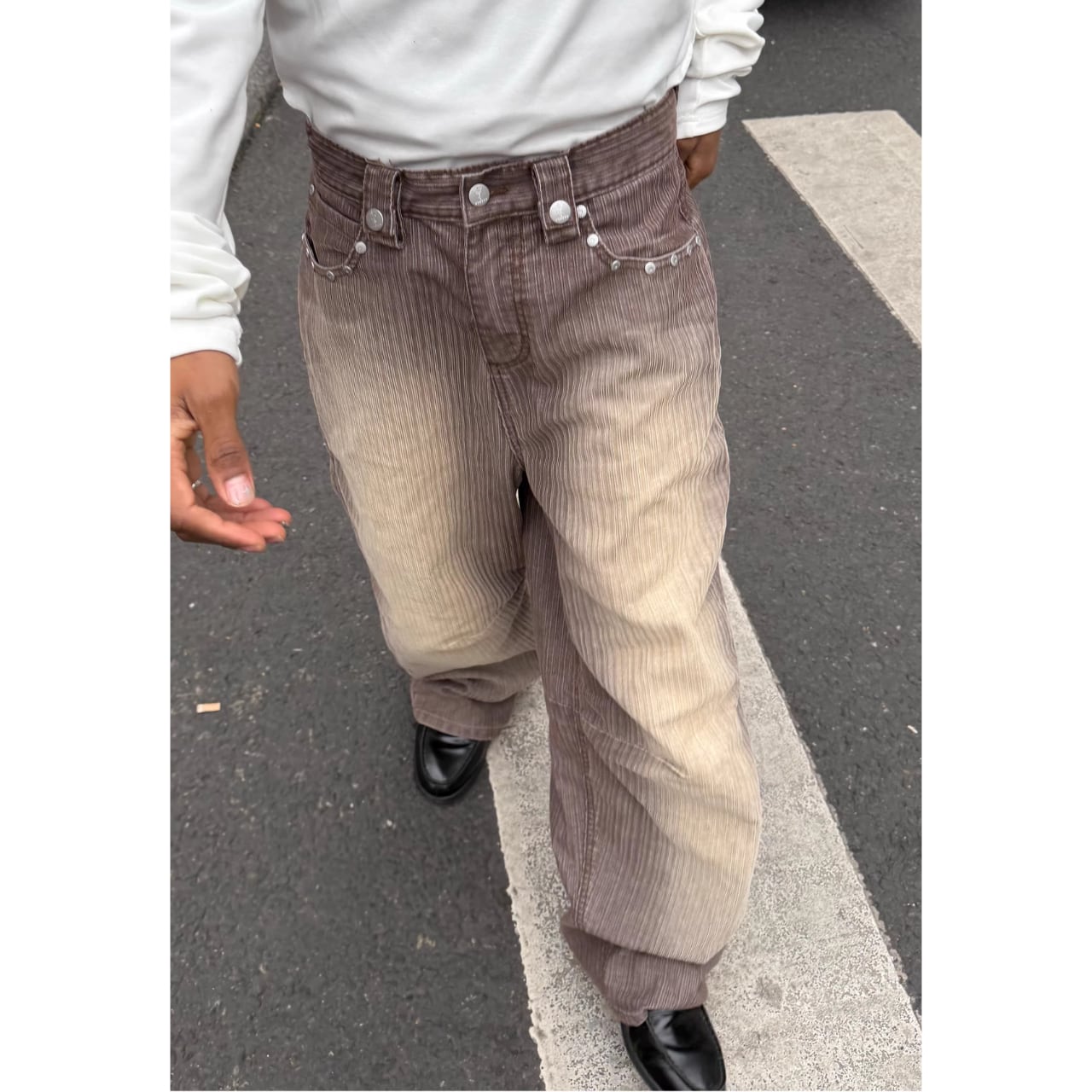 ウォッシュ加工が施されたコーデュロイ生地に、グラデーションカラーが目を引くストレートパンツ。