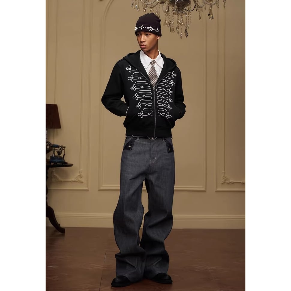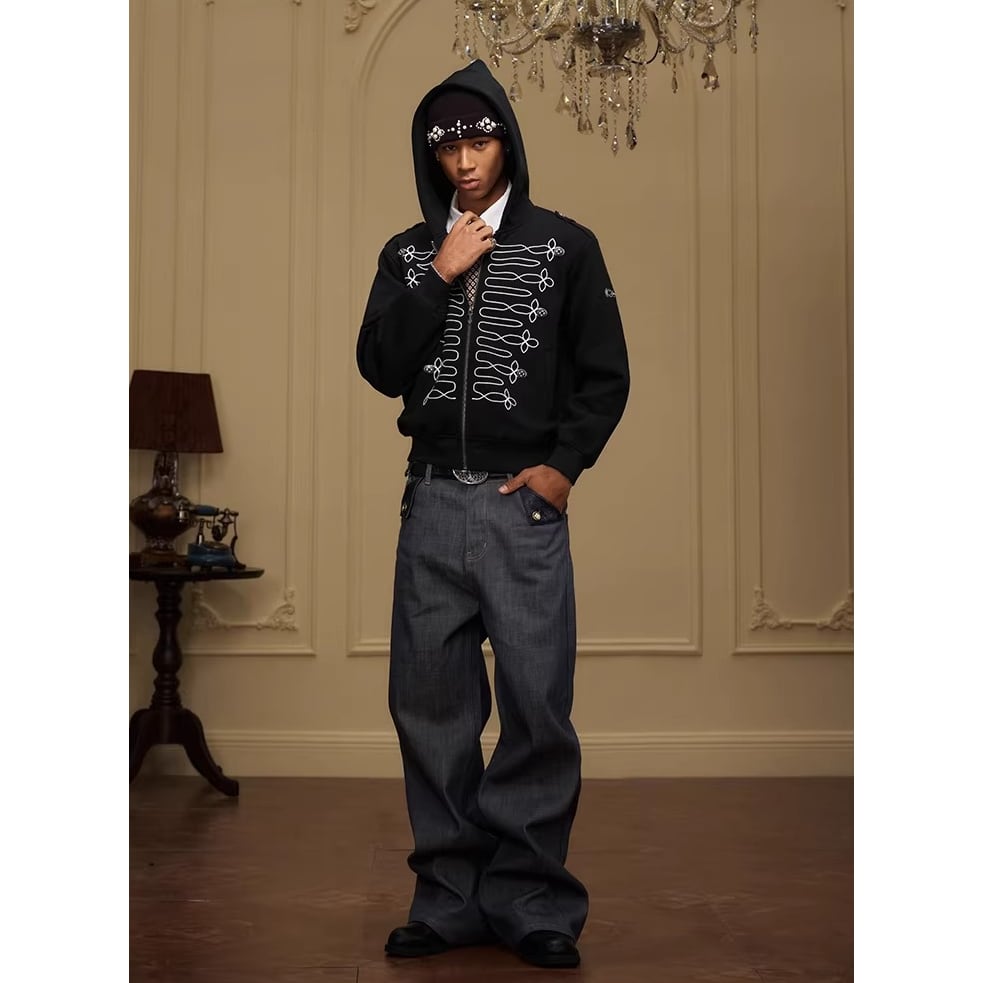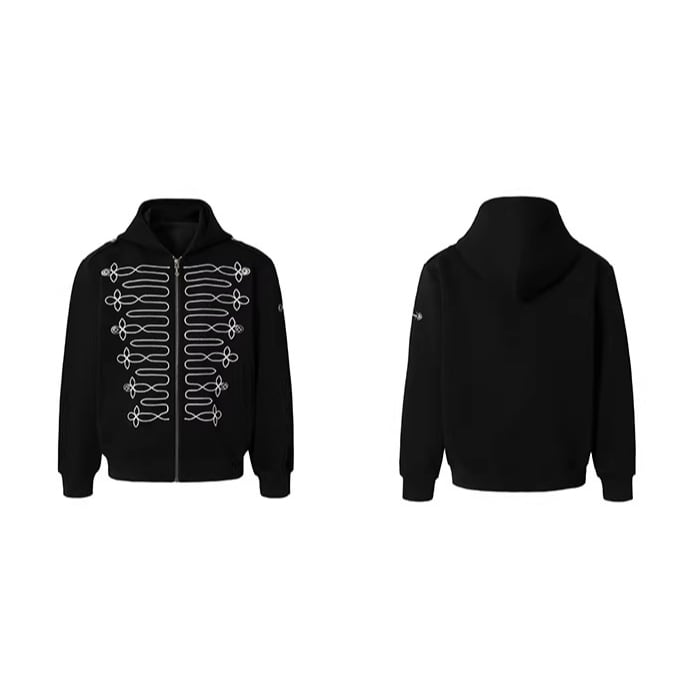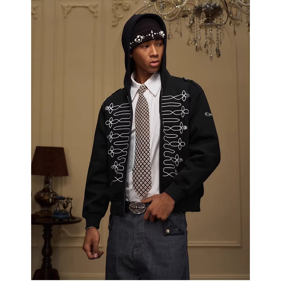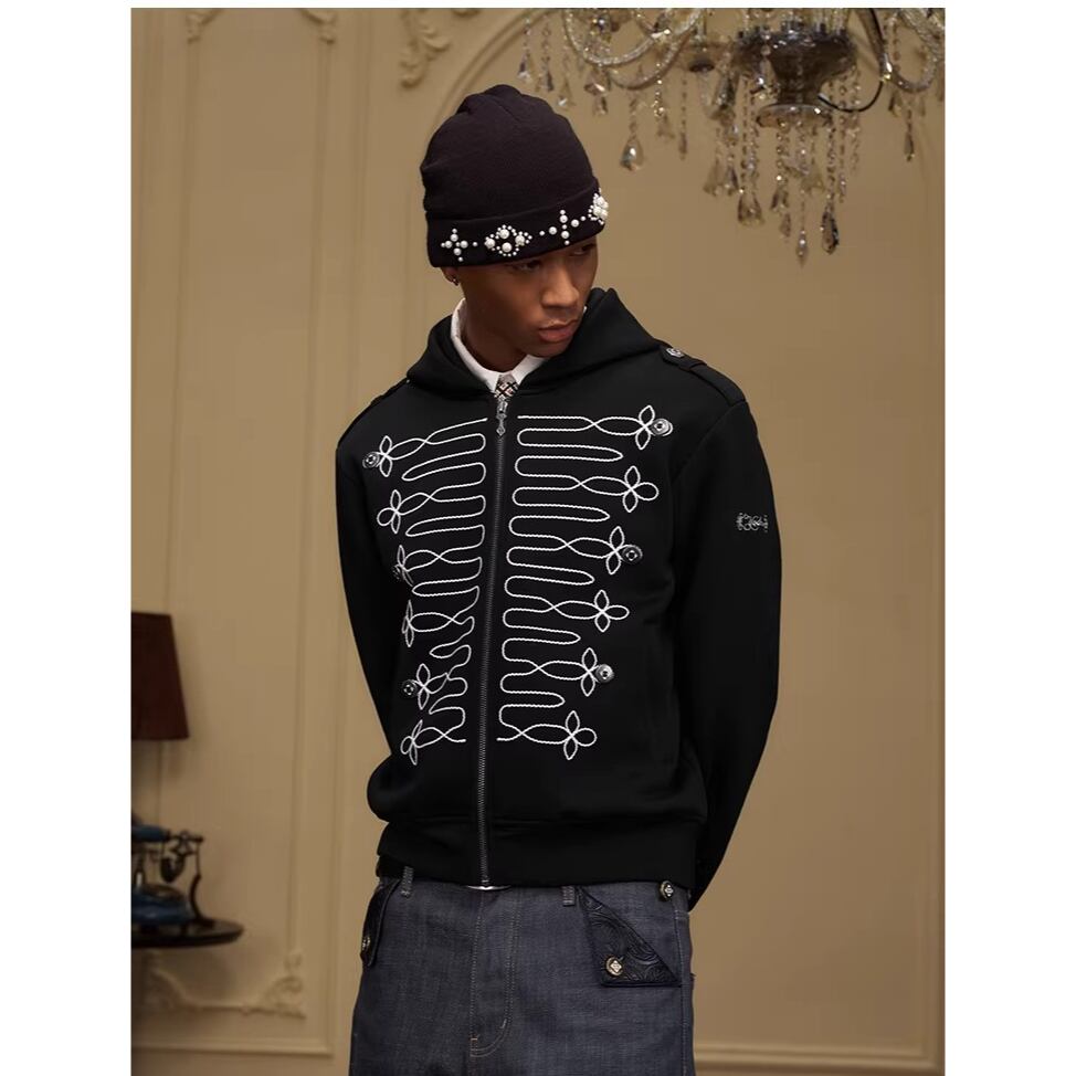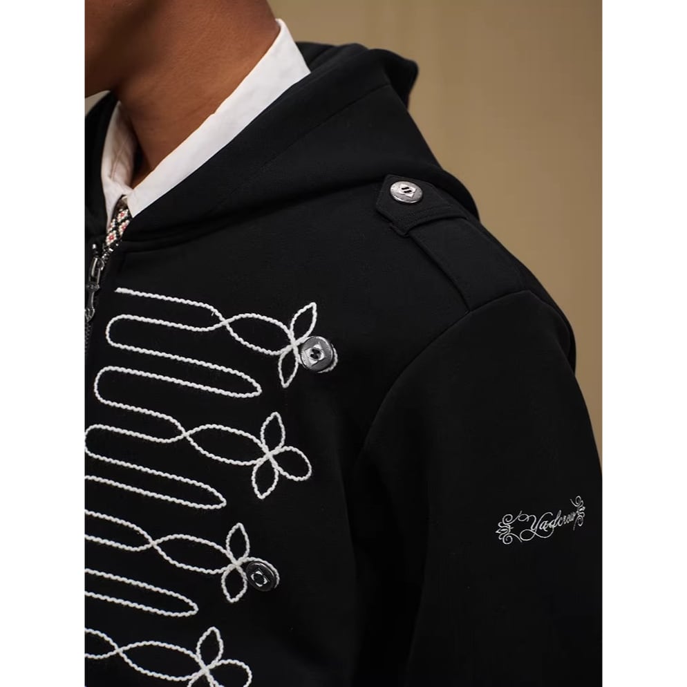 ミリタリージャケットのような装飾的な刺繍が目を引くジップアップフーディー。