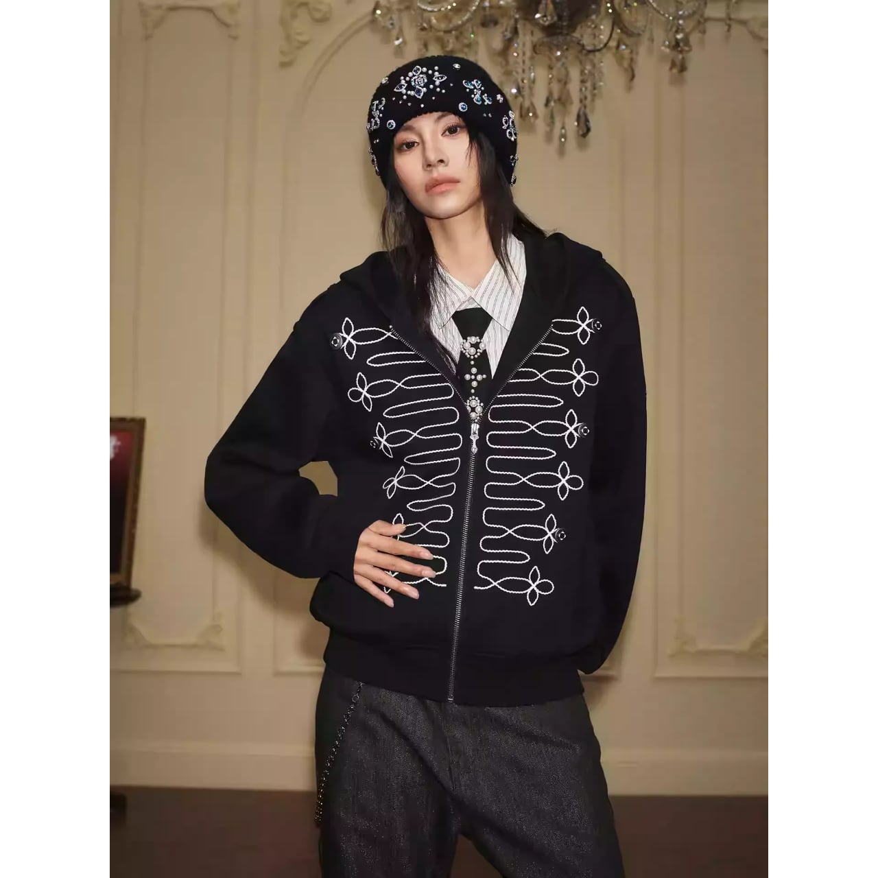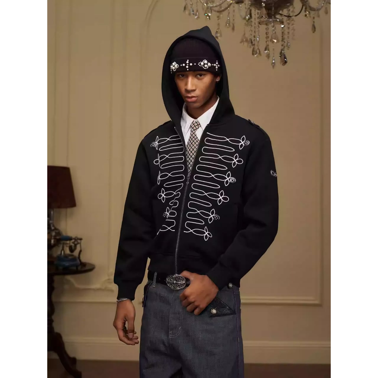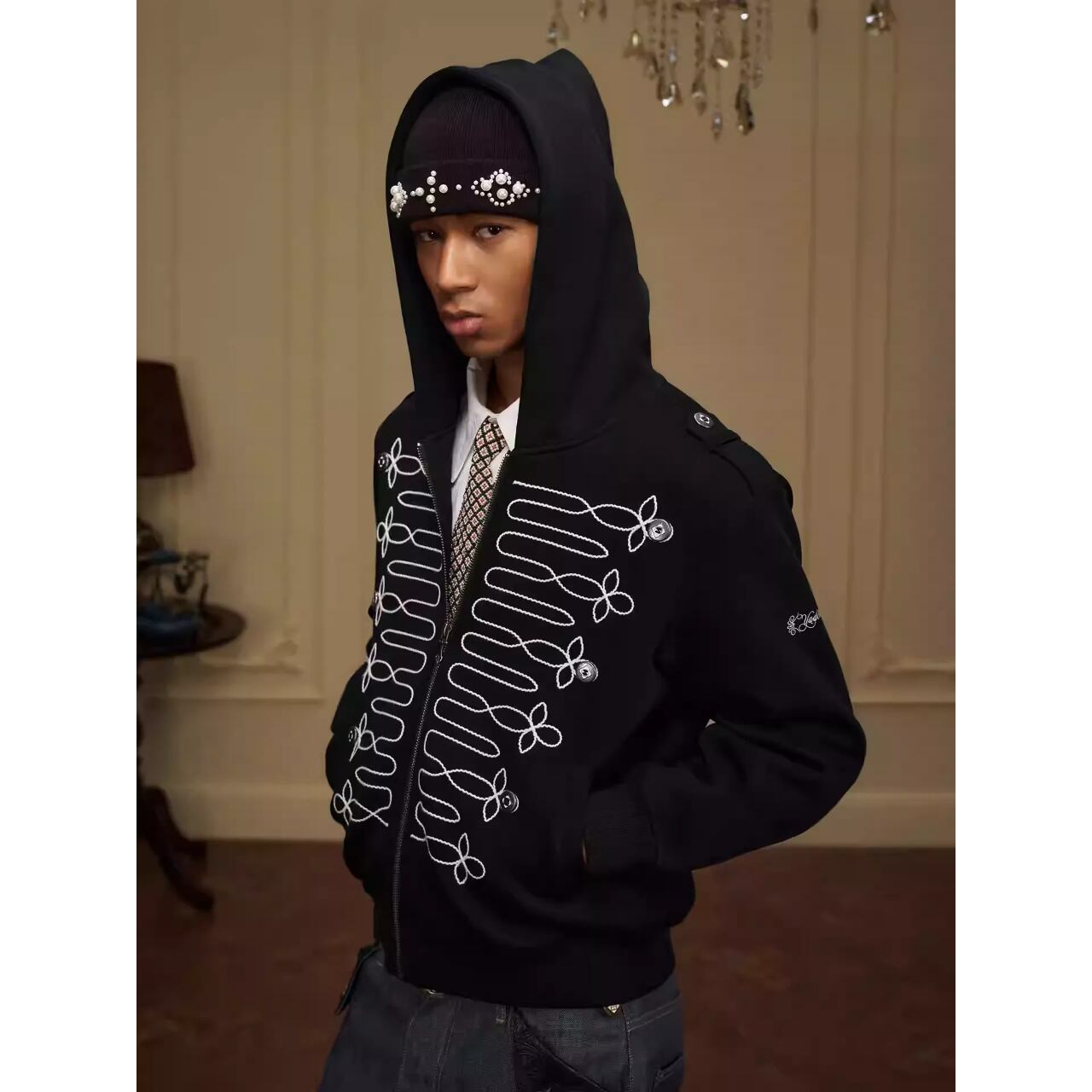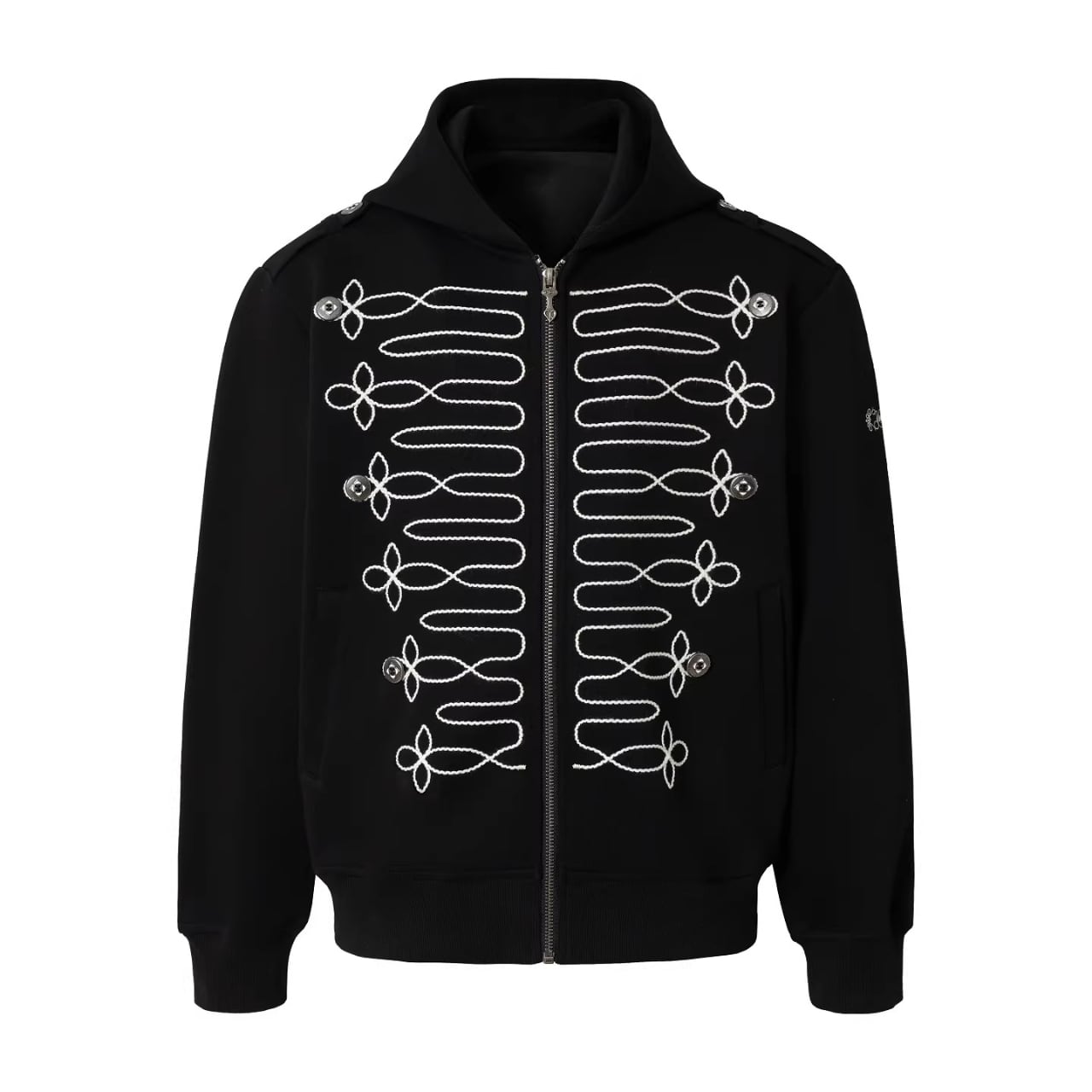ミリタリージャケットのような装飾的な刺繍が目を引くジップアップフーディー。