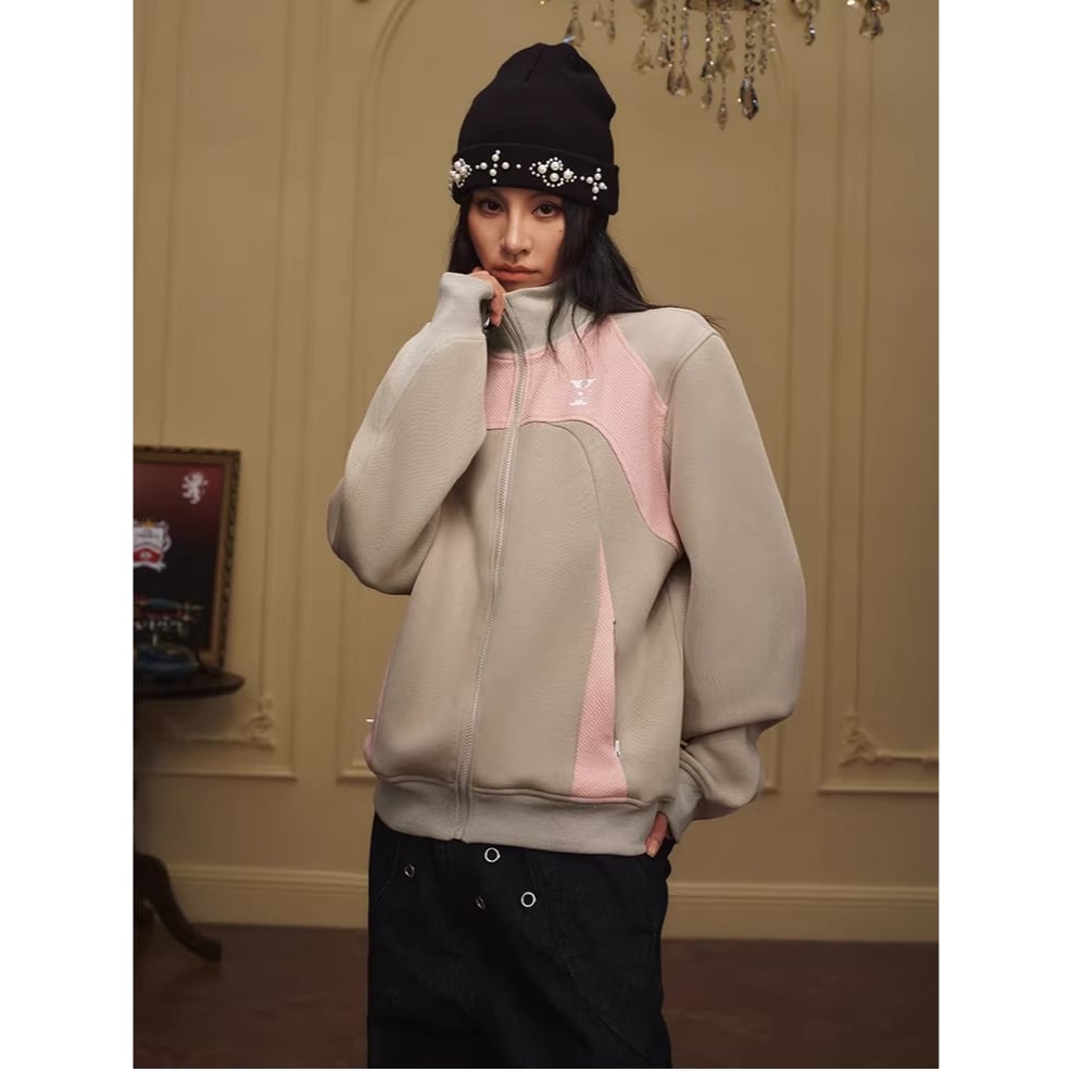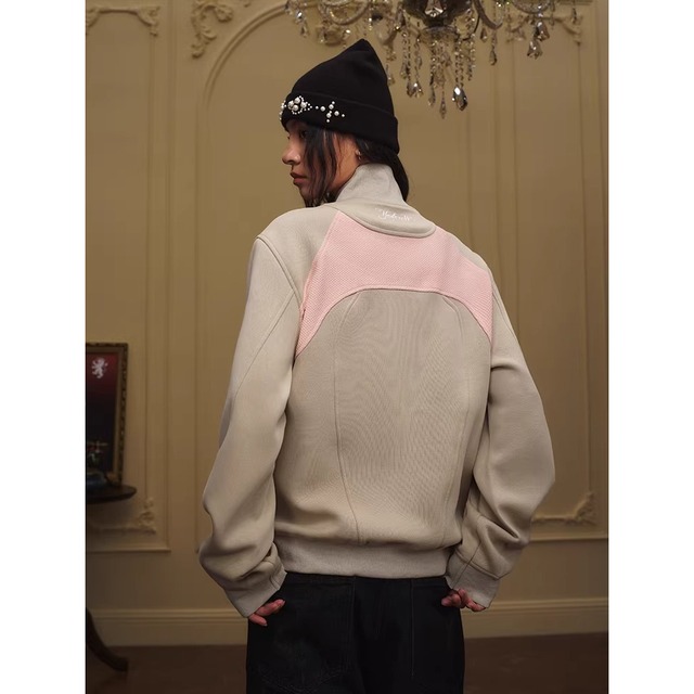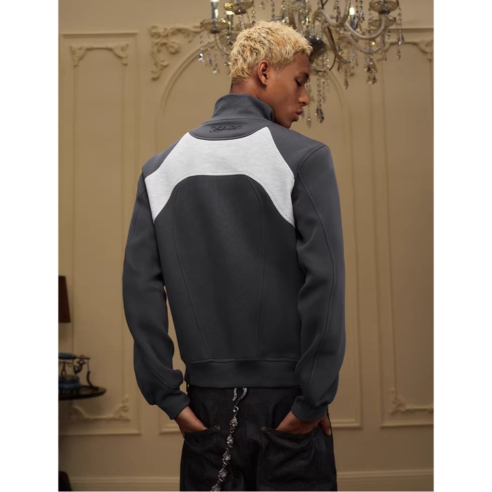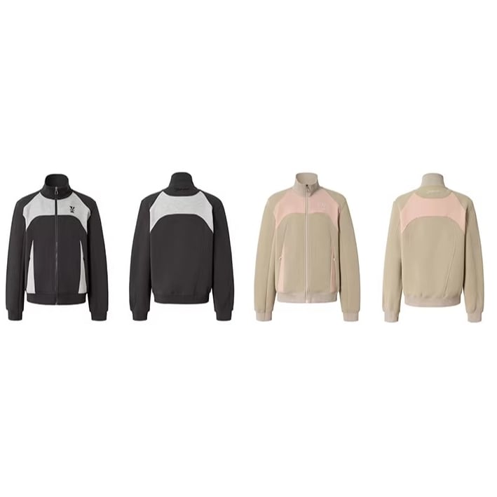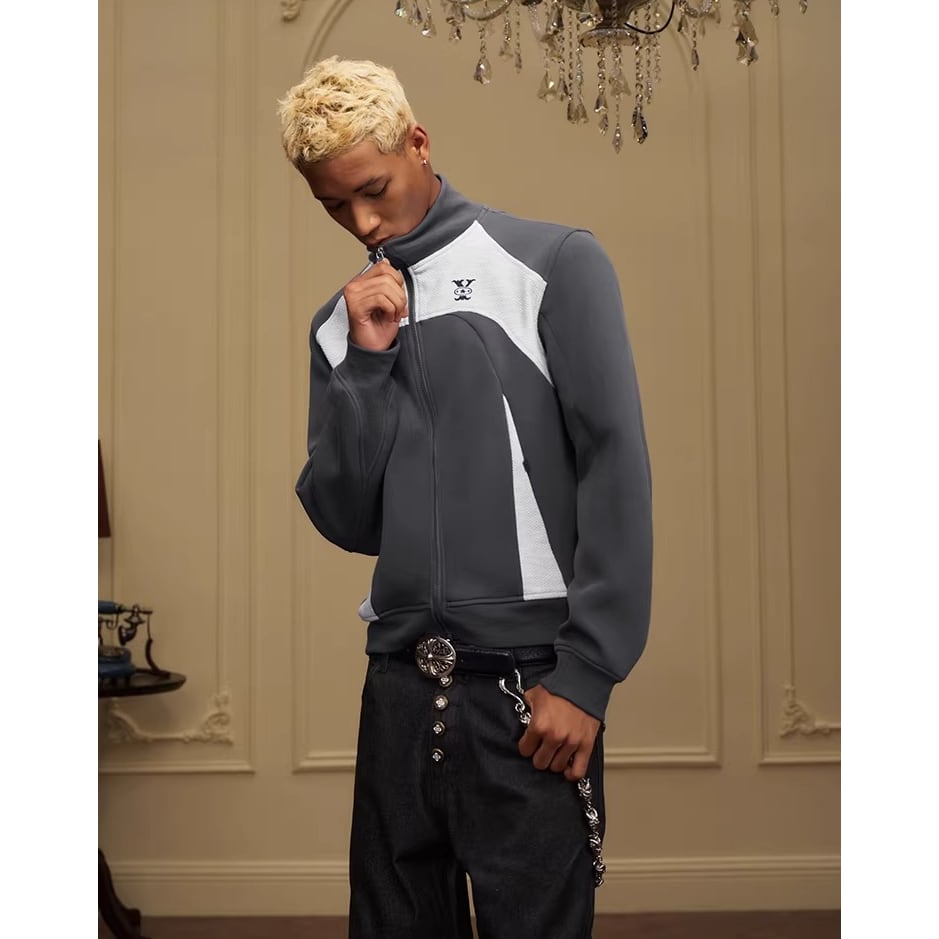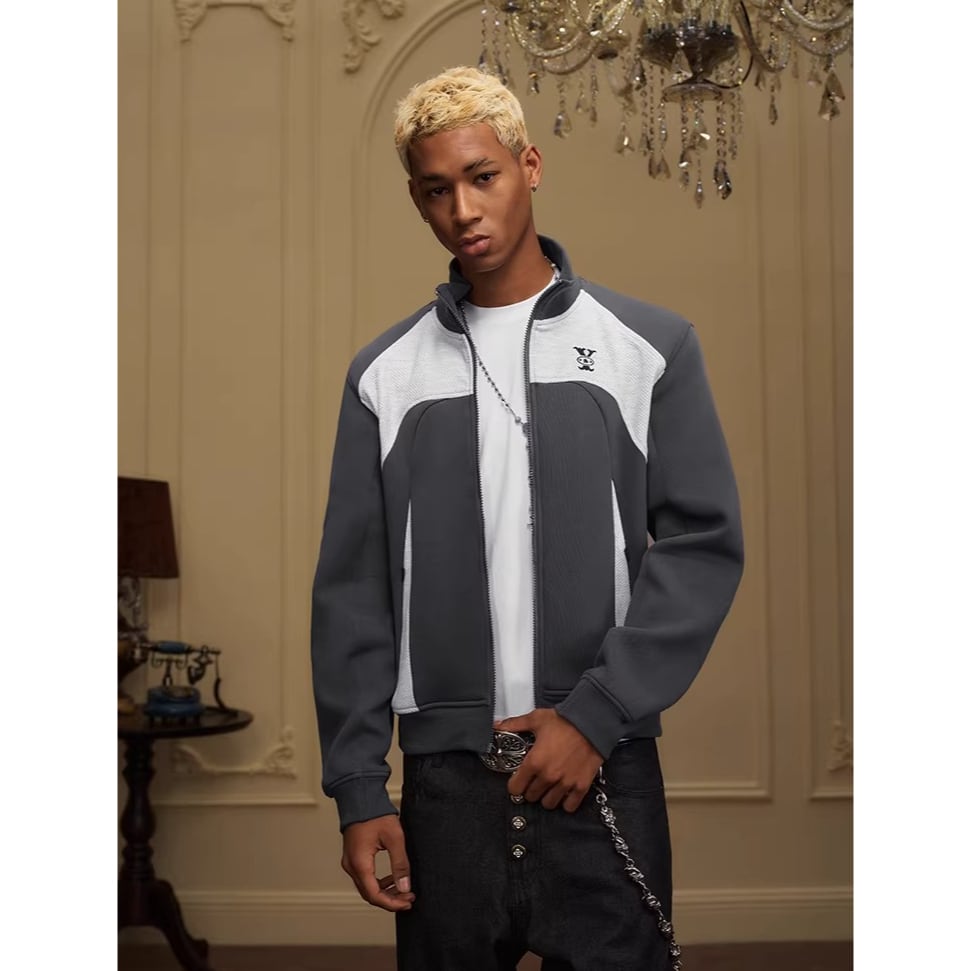 カラーブロックデザインが目を引くジップアップジャケット。