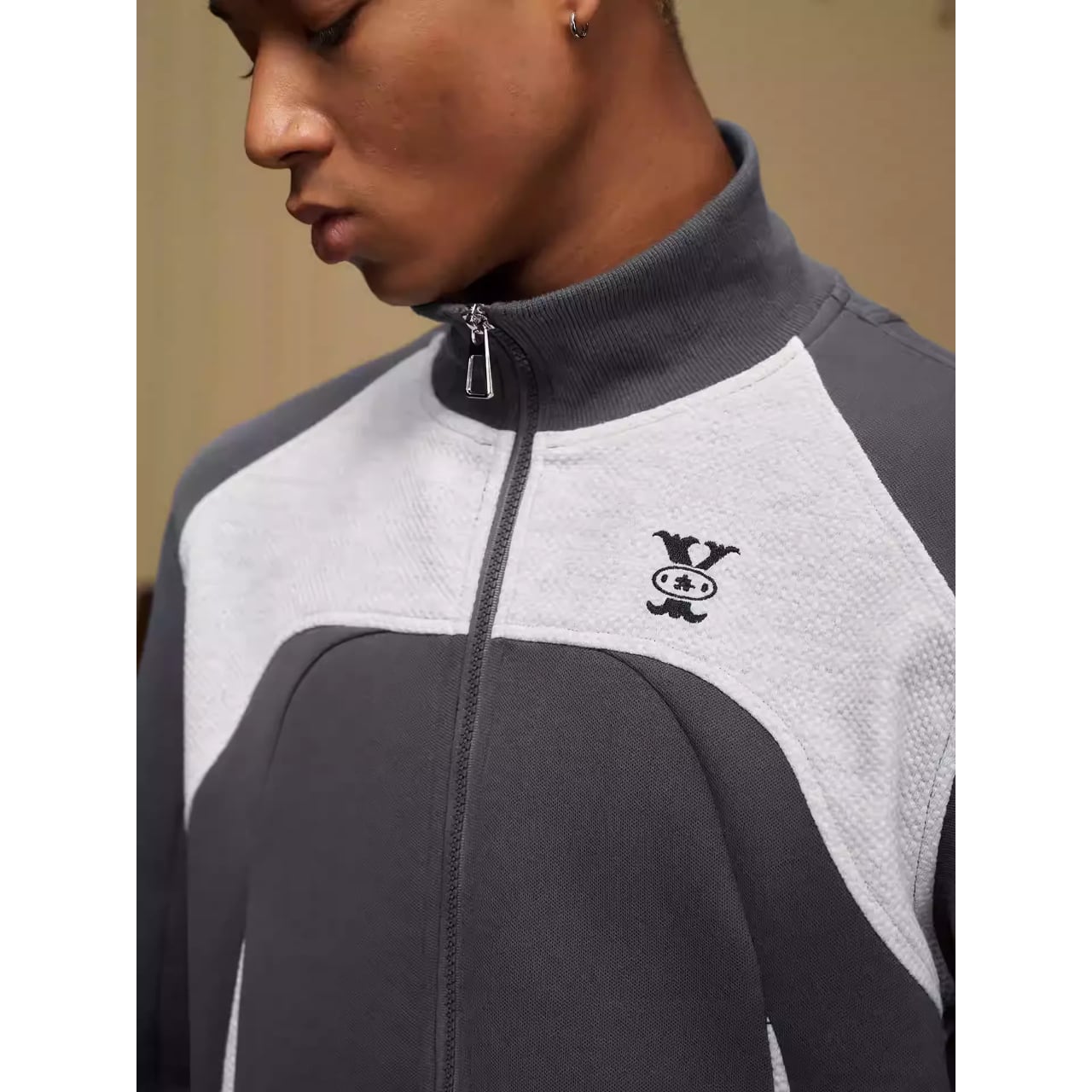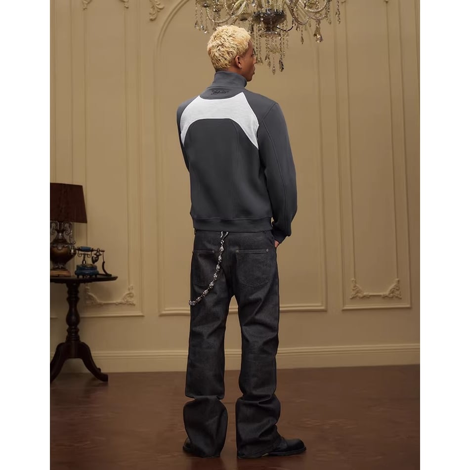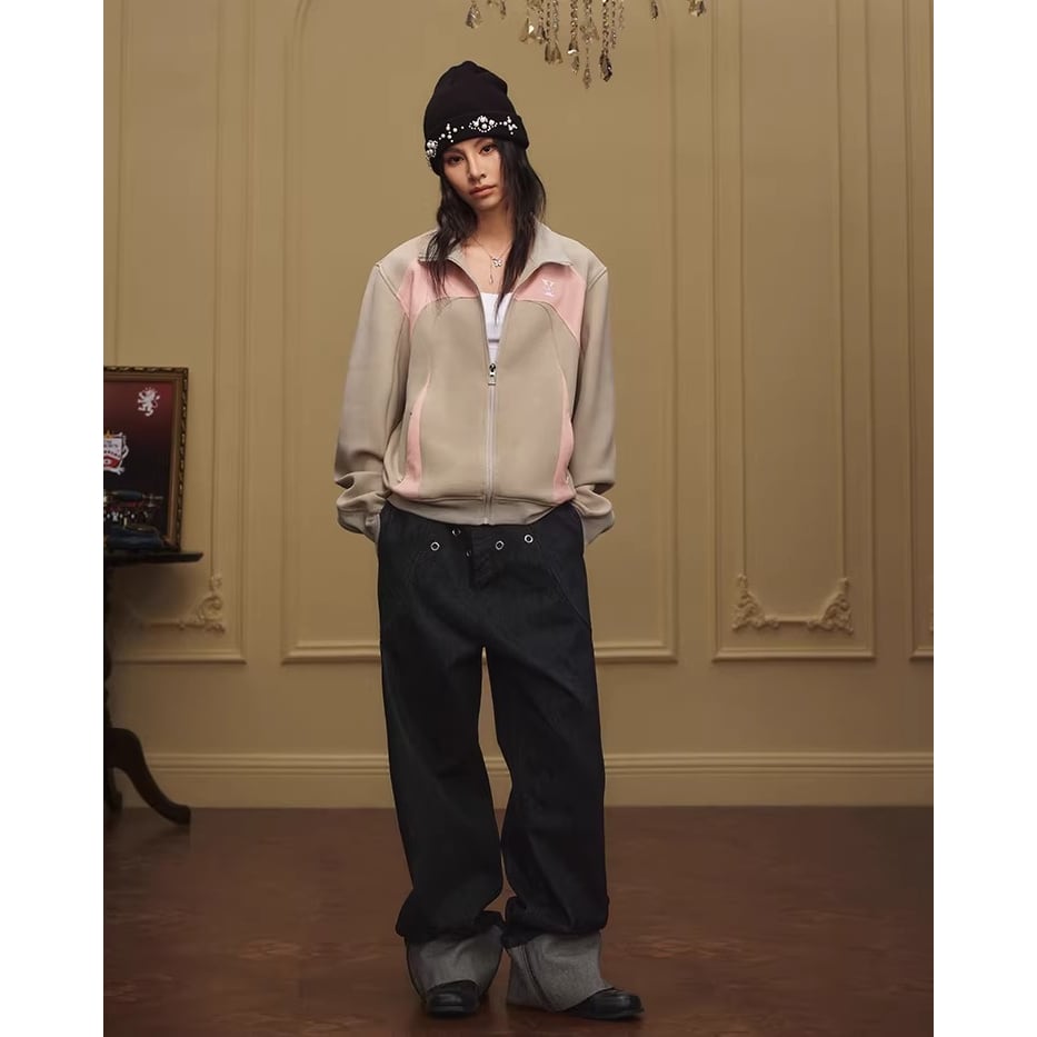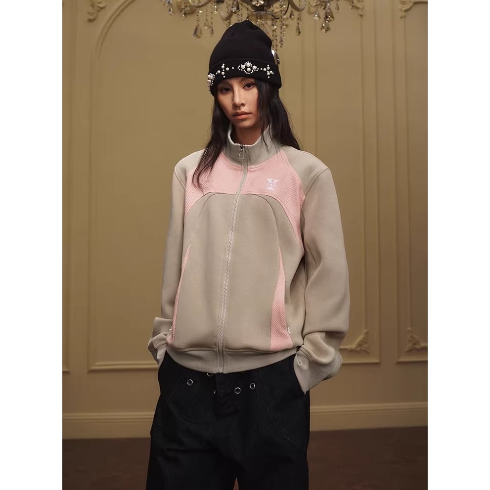 カラーブロックデザインが目を引くジップアップジャケット。