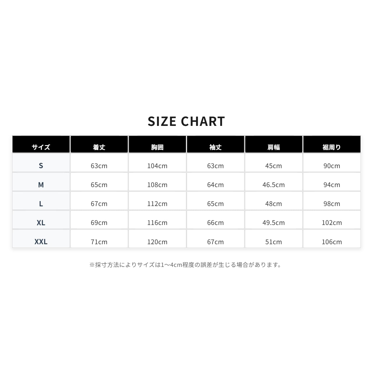 【S】 着丈63cm/胸囲104cm/袖丈63cm/肩幅45cm/裾周り90cm