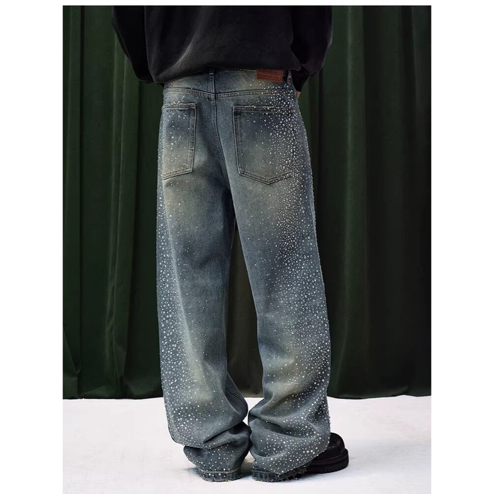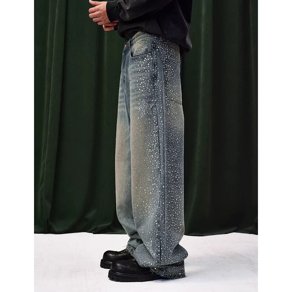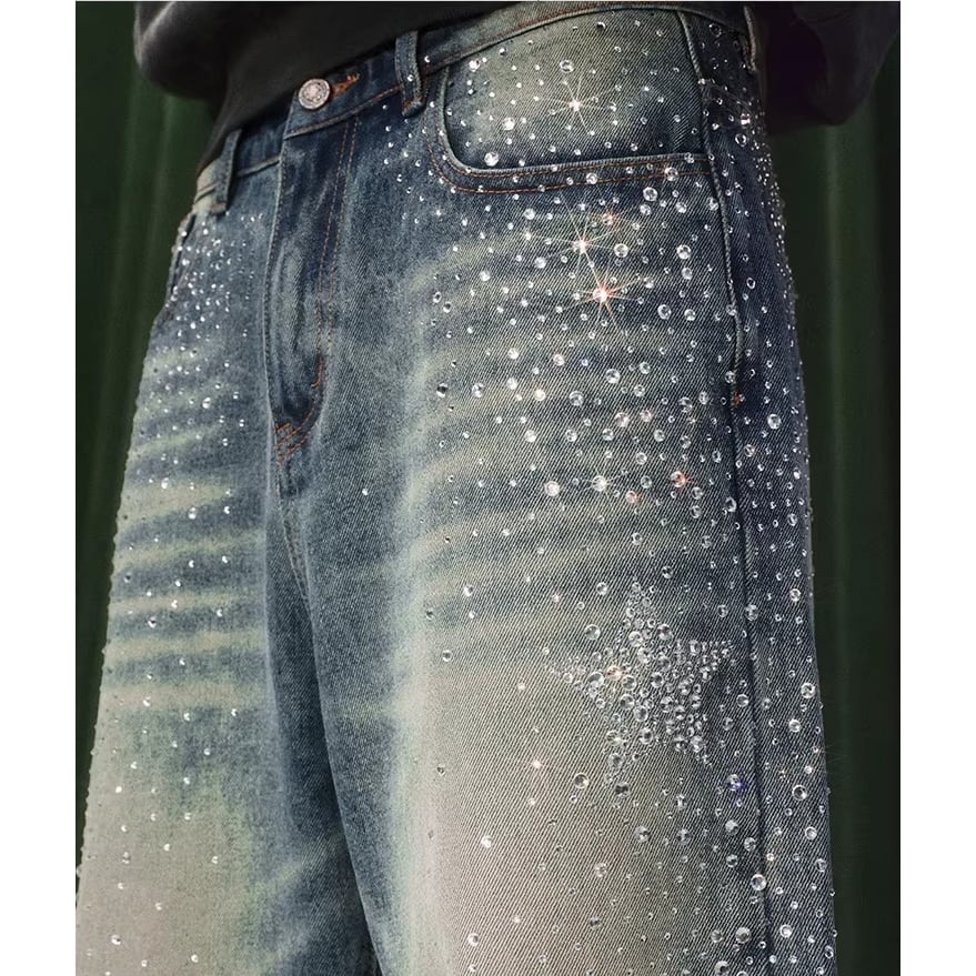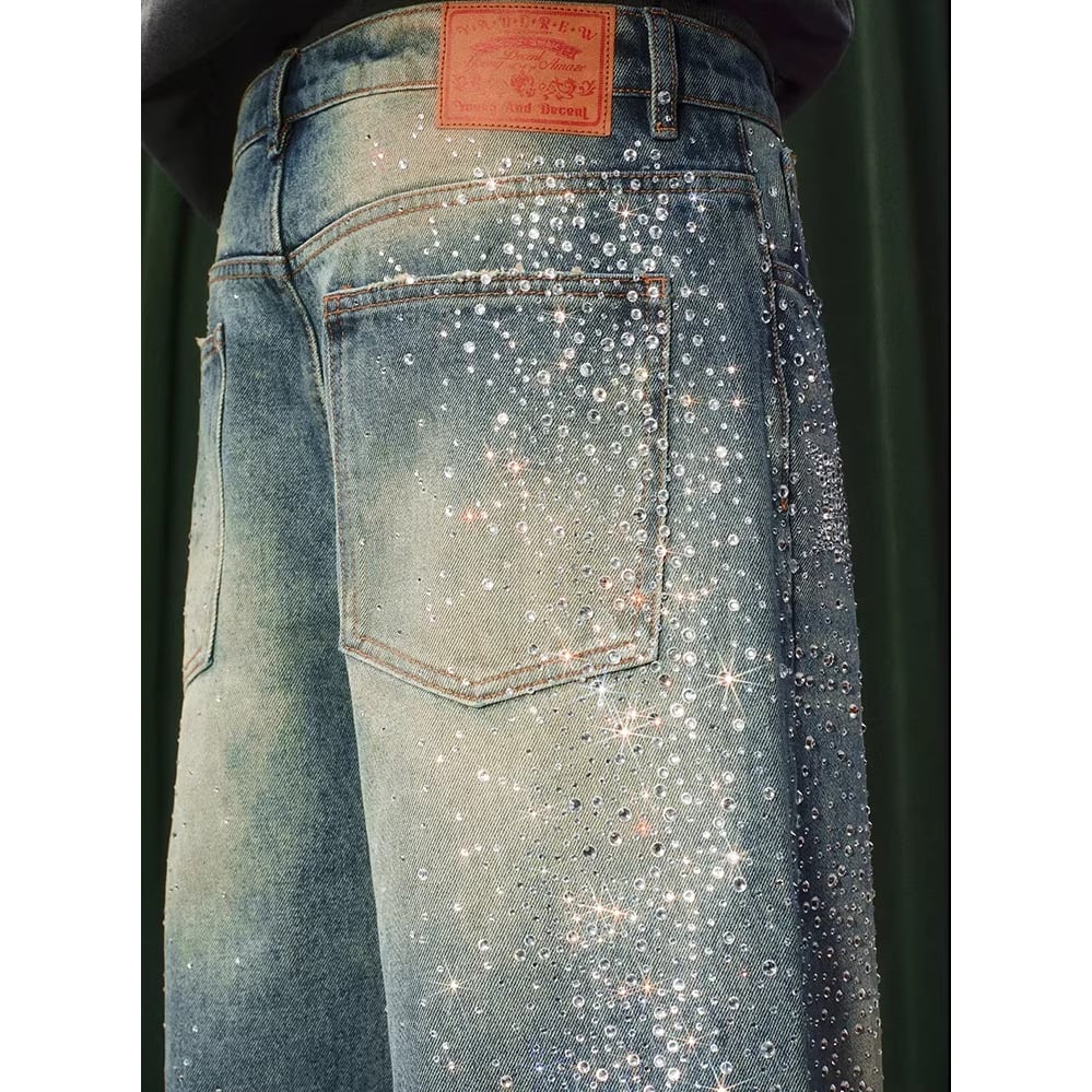 【DRIP6838】YAD CREW Rhinestone Washed Wide-Leg Denim Pants