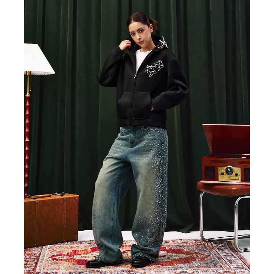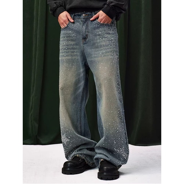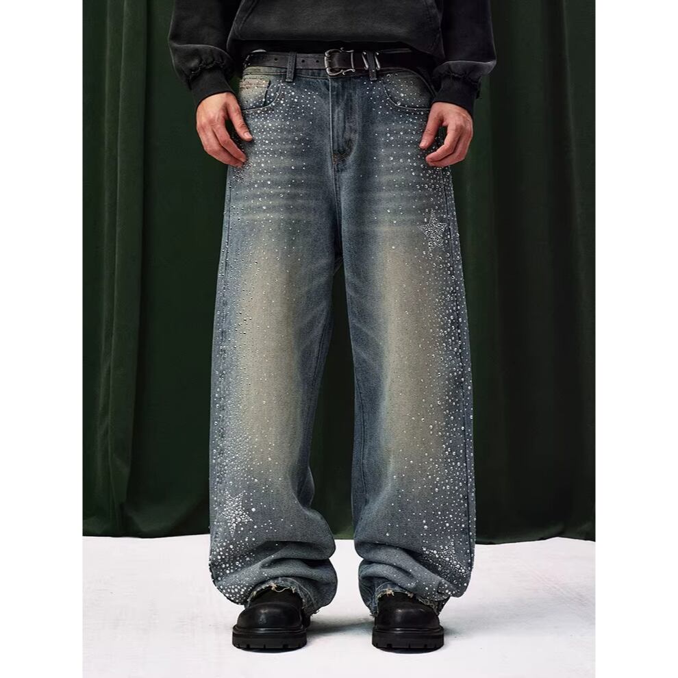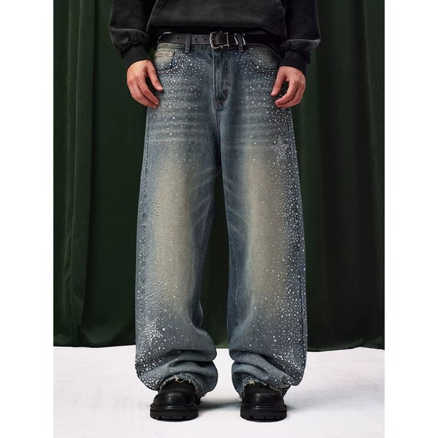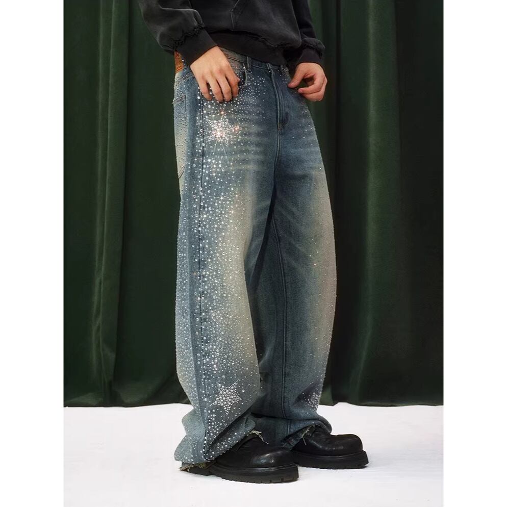 【DRIP6838】YAD CREW Rhinestone Washed Wide-Leg Denim Pants