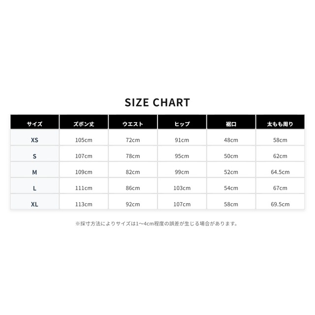 【XS】 ズボン丈105cm/ウエスト72cm/ヒップ91cm/裾口48cm/太もも周り58cm